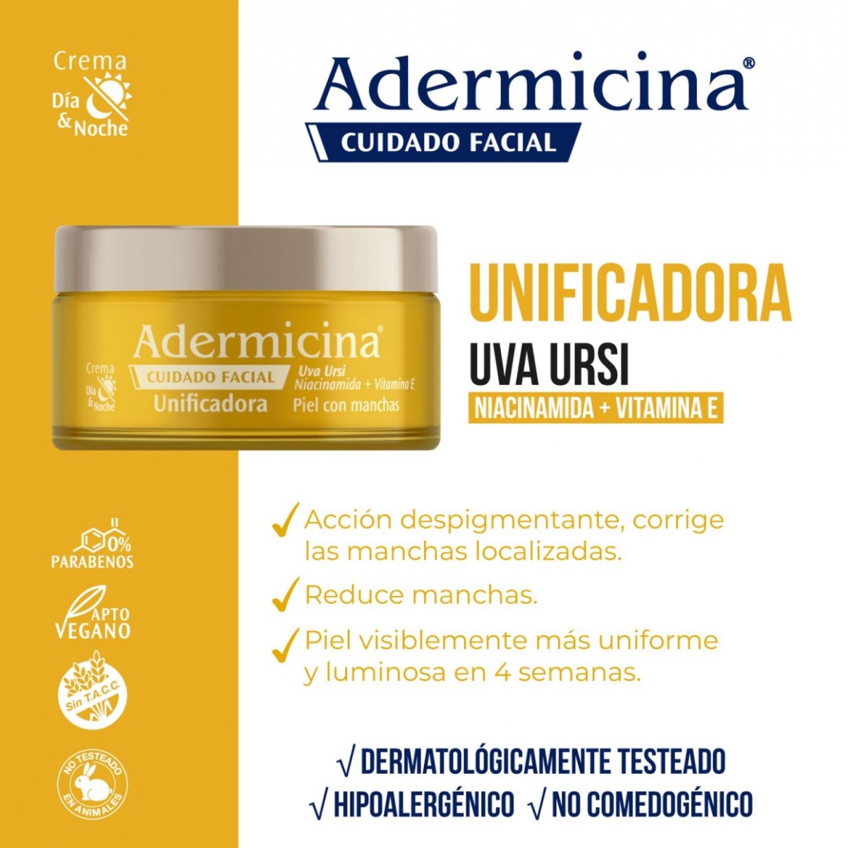 Adermicina Cuidado Facial Unificadora es una crema que hidrata y unifica el tono de la piel, proporcionando un efecto aclarante sobre el rostro. Sus principales activos con poder despigmentante actúan complementándose para conseguir una piel más uniforme y luminosa, y renuevan su apariencia logrando un tono homogéneo.