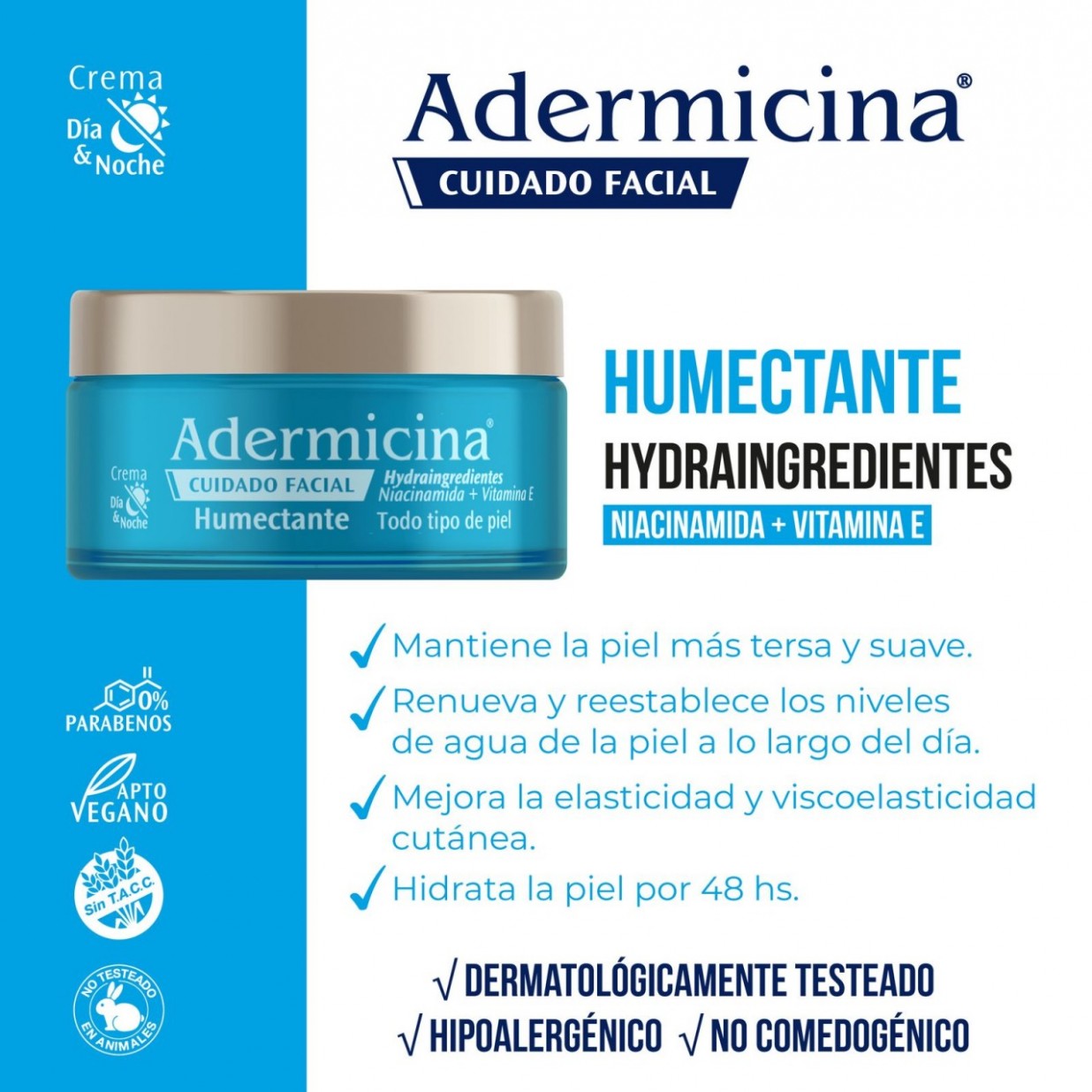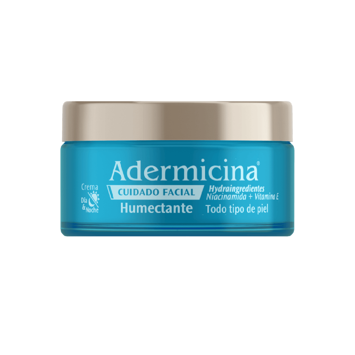 Adermicina Cuidado Facial Humectante es una crema con Hydraingredientes que humectan y mantienen la piel hidratada, otorgándole una sensación de frescura desde la primera aplicación. Contiene Niacinamida que fortalece la función de barrera de la piel equilibrando su hidratación. Su exclusiva fórmula protege la piel de la polución y agentes externos, logrando que sea una crema apta para usar en todo tipo de climas.