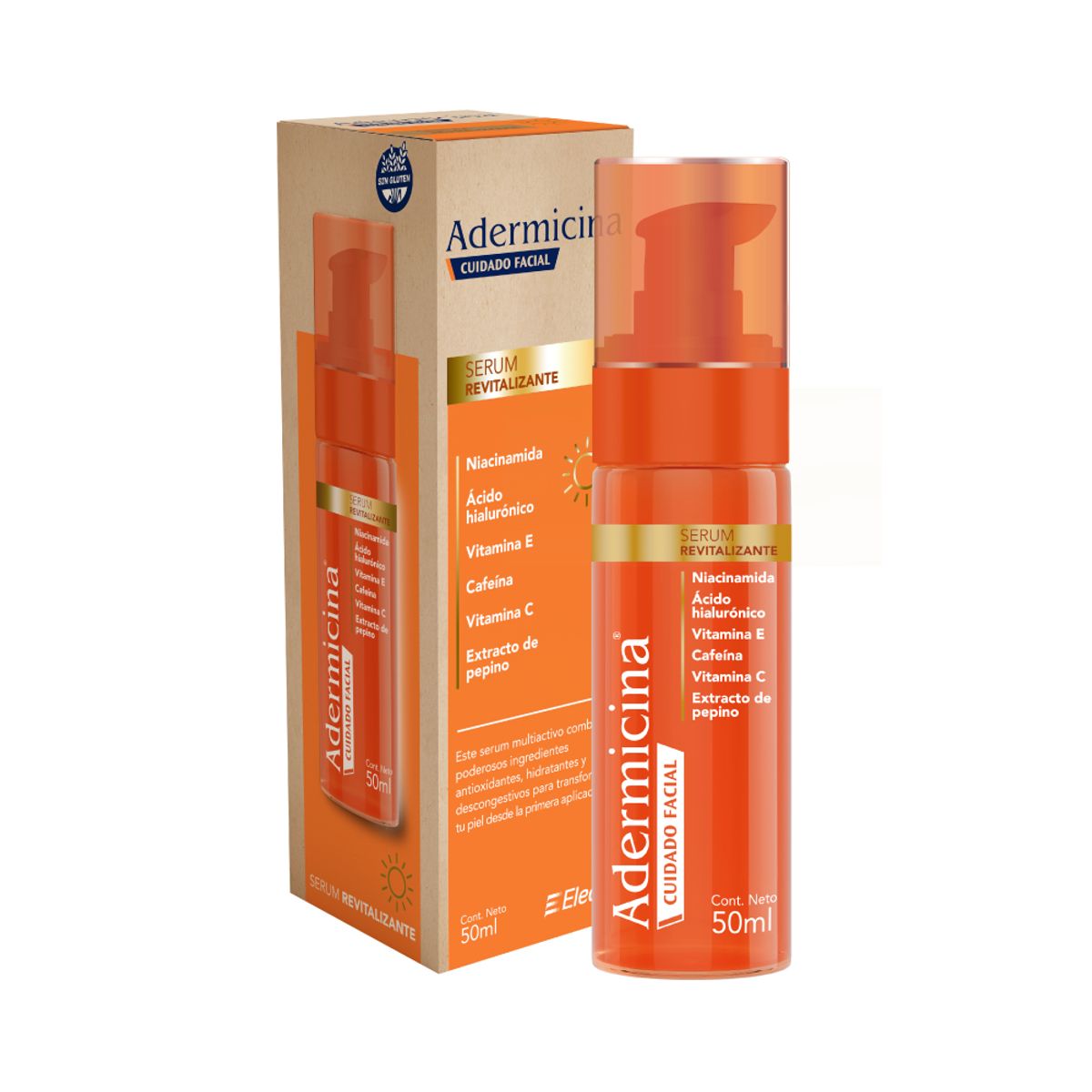 El Serum Revitalizante Adermicina es un tratamiento facial que mejora la luminosidad, unifica el tono y revitaliza la piel, combinando ingredientes como Niacinamida, Ácido Hialurónico, Cafeína y Vitamina C para hidratar profundamente, fortalecer la barrera cutánea y combatir los signos del envejecimiento, ofreciendo un acabado fresco y luminoso. Su textura ligera se absorbe rápido y es apto para todo tipo de piel, ideal para renovar la apariencia y elasticidad cutánea.