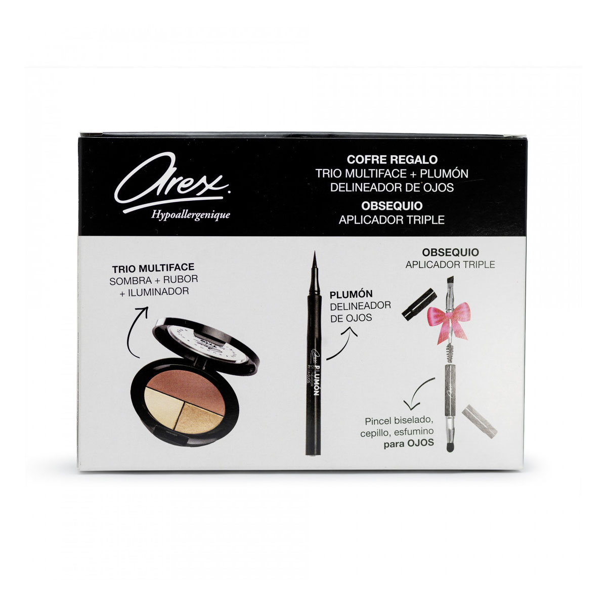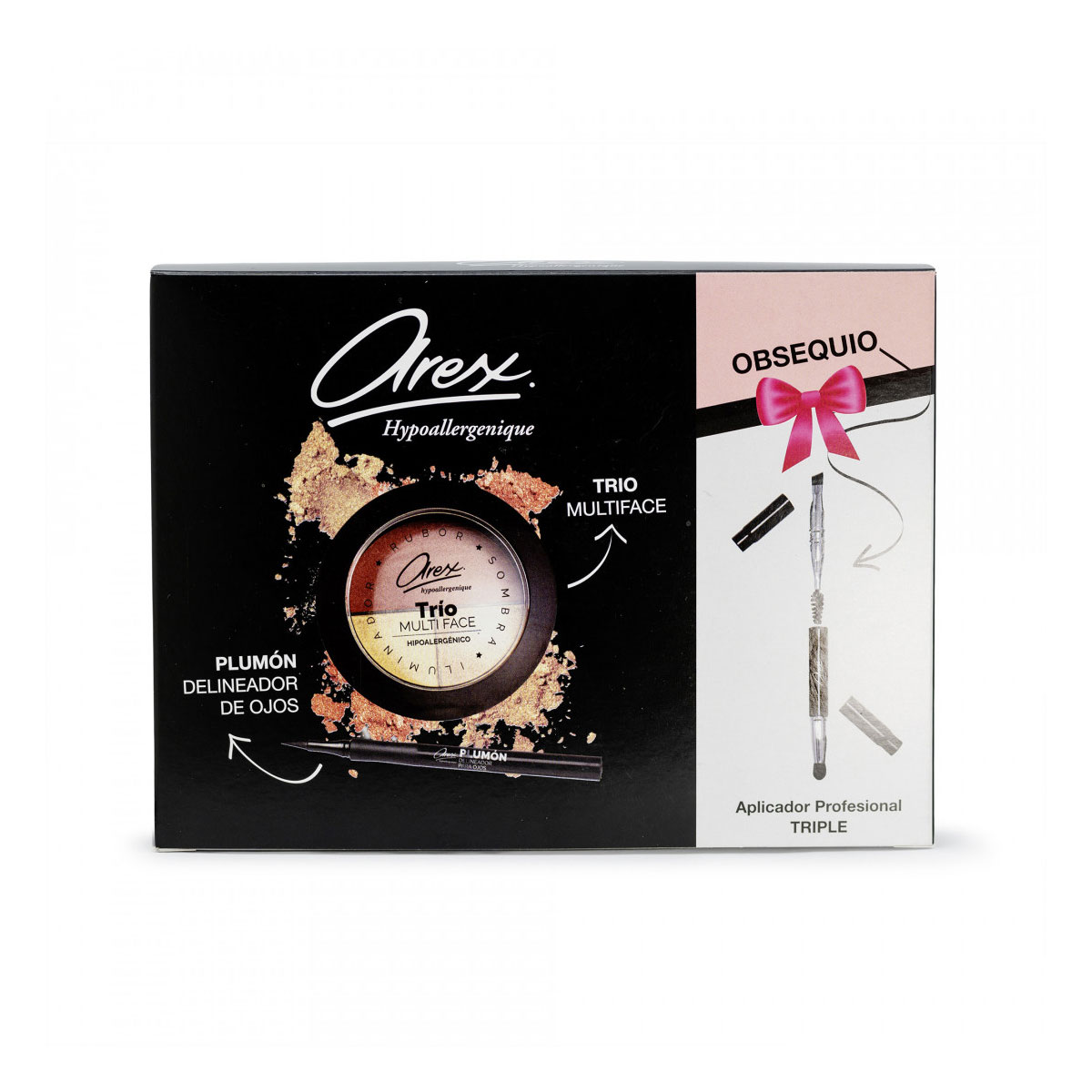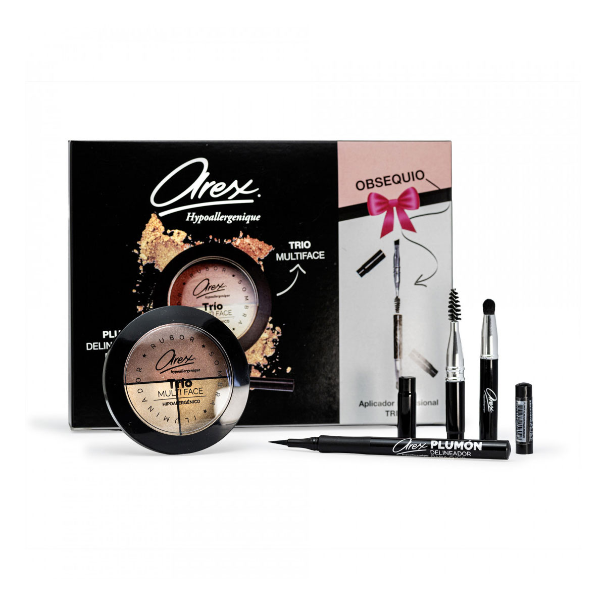 El Cofre de Regalo AREX 661 contiene: Trio Multiface + Delineador de Ojos Plumón + Aplicador 3 en 1 de Obsequio. El Polvo Facial Trio Multiface (código 569) está compuesto de: Sombra, Rubor e Iluminador ¡Todo en uno!