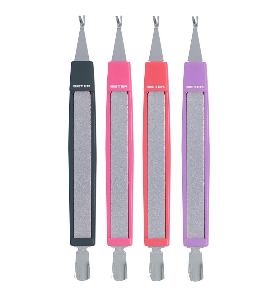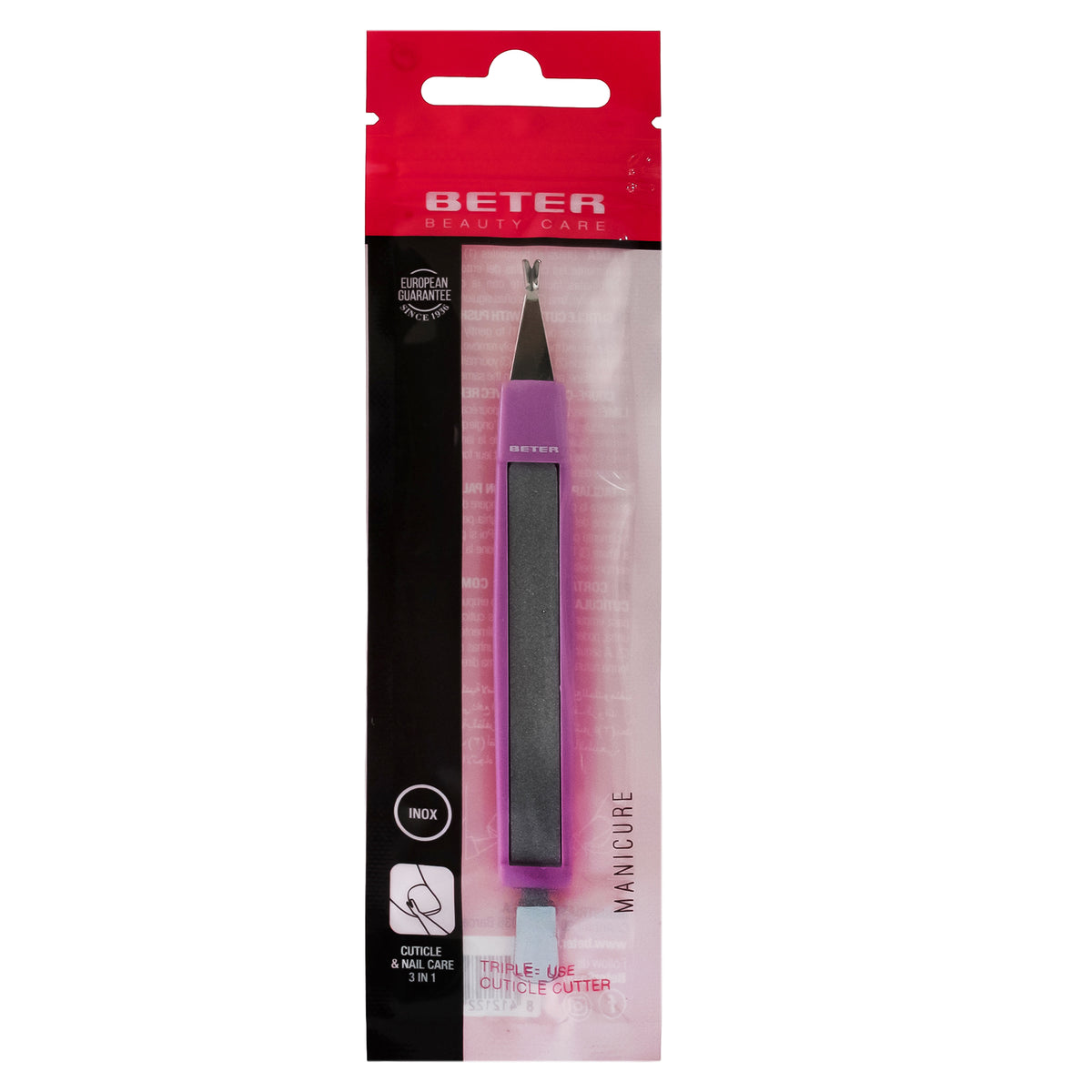Un 3 en 1 muy práctico: cortacutículas, lima y bajapieles en una sola pieza. Fabricado en acero inoxidable tratado, permite eliminar las cutículas, despejar tus uñas y limarlas en un momento