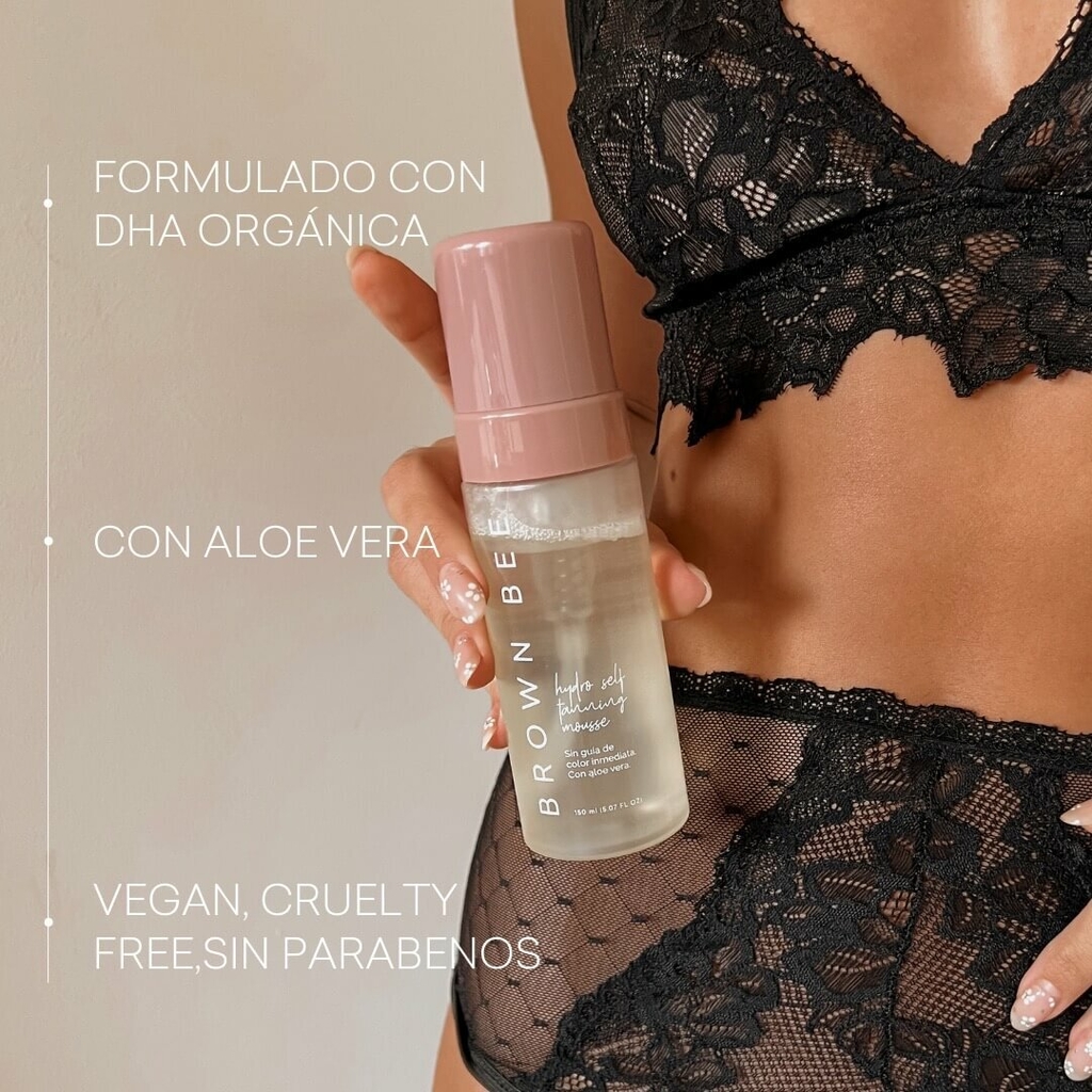 Autobronceante en formato mousse de formulación profesional sin guía de color inmediata, de secado rápido y más limpio ya que la espuma es transparente. Libre de mal olor, aroma a almendras. Formulado con DHA orgánica.