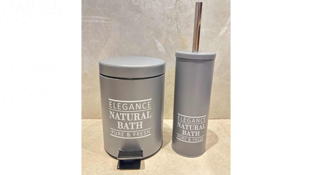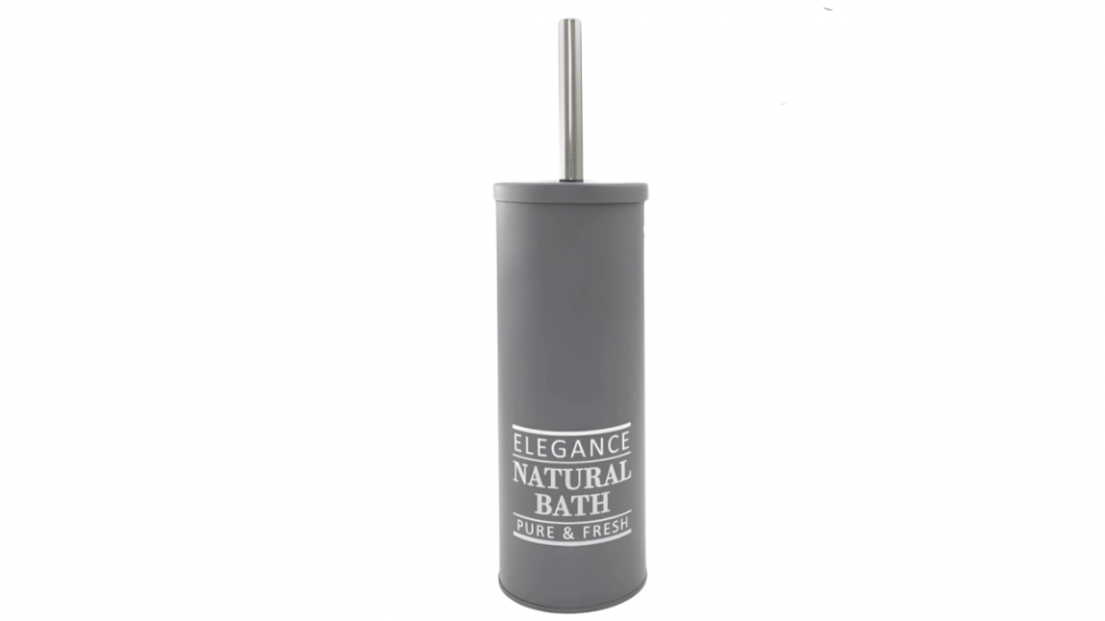 Escobilla de baño en material metal. Se compone de una base alta, una escobilla y por dentro un recipiente para facilitar su limpieza.