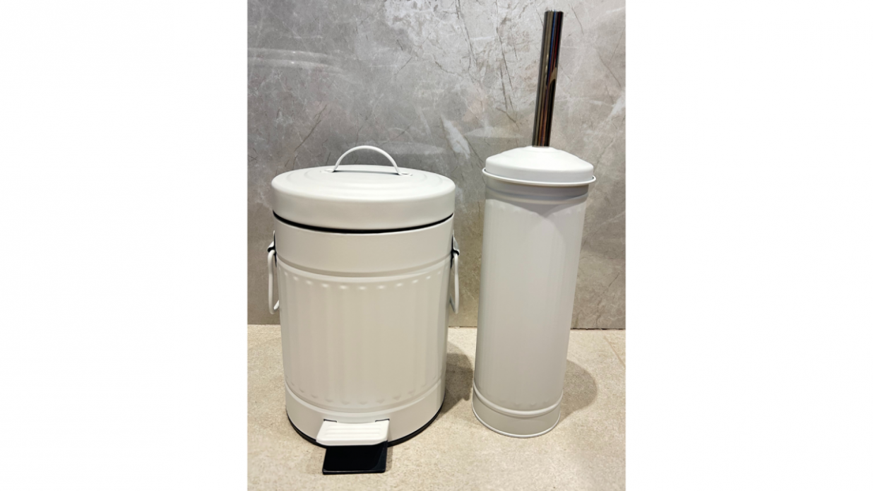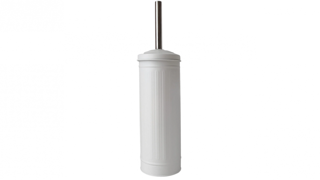 Escobilla de baño en material metal. Se compone de una base alta, una escobilla y por dentro un recipiente para facilitar su limpieza.
