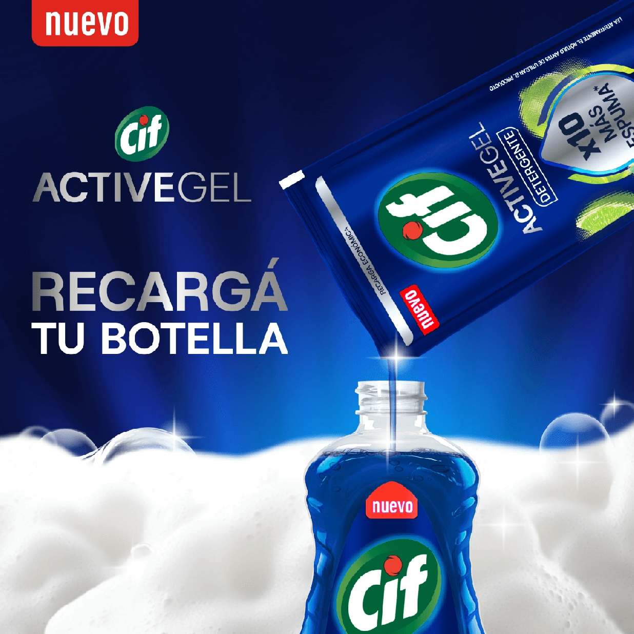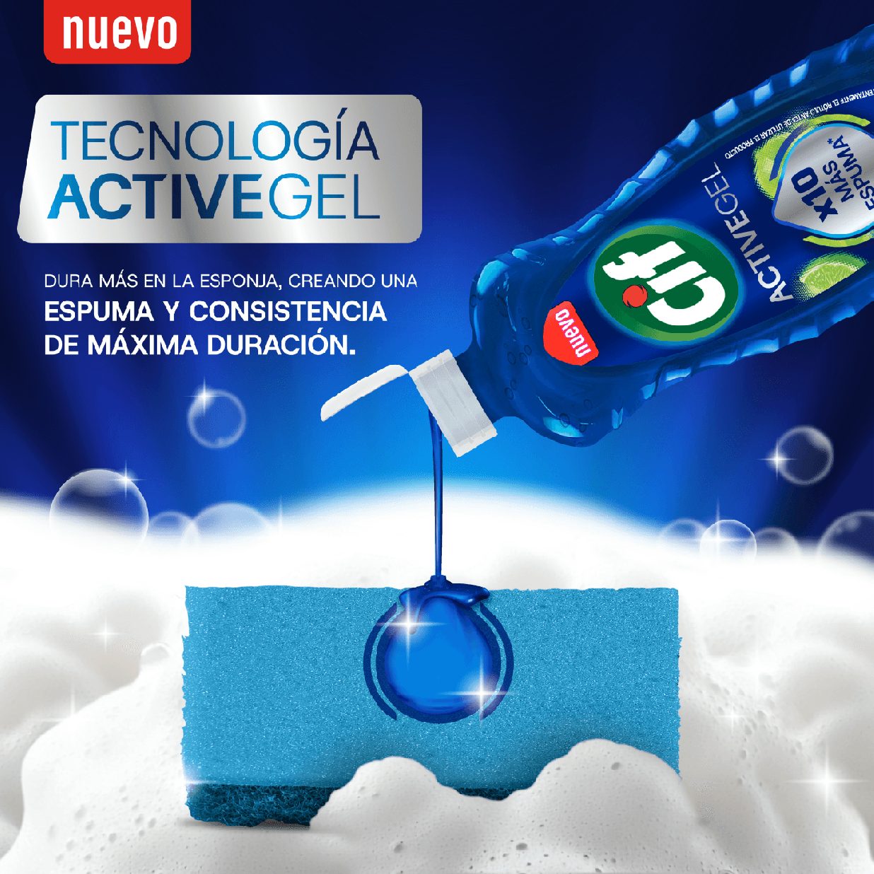 Su tecnología active gel hace que el producto dure mas en la esponja, generando 10 veces más espuma que otros detergentes concentrados. Espuma y consistencia de máxima duración.