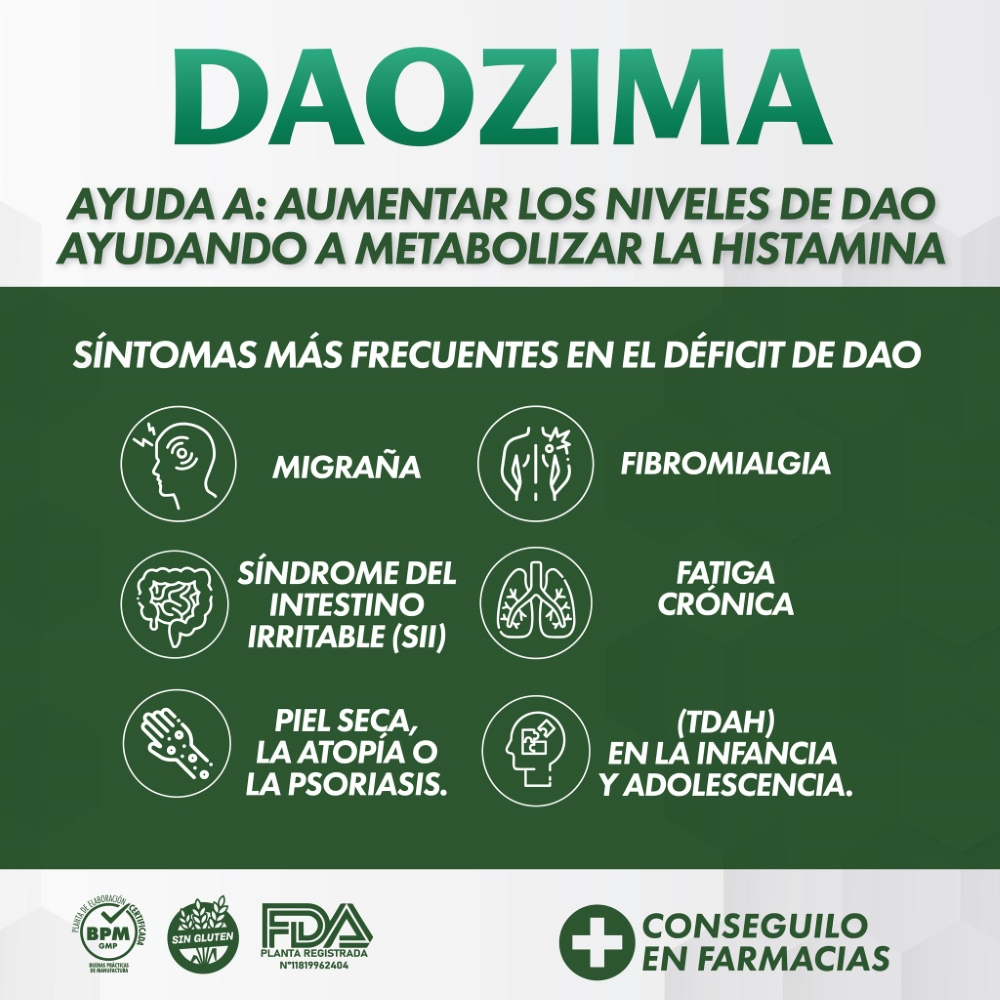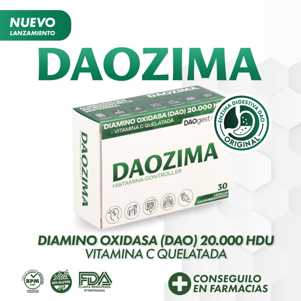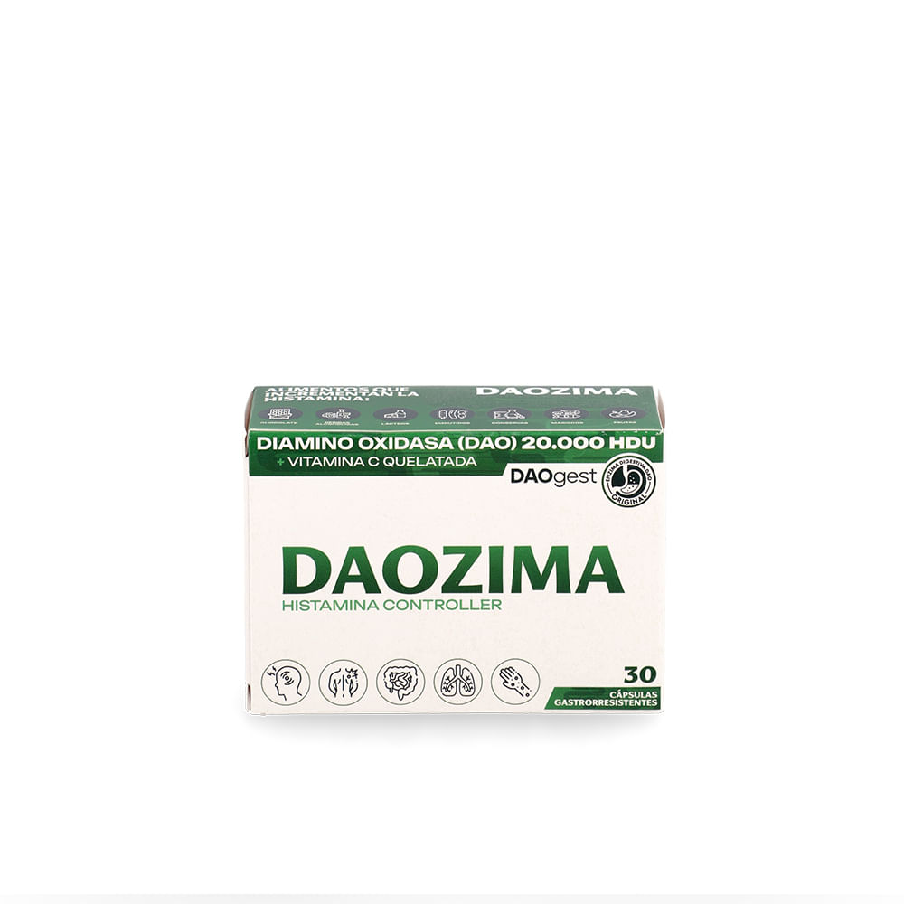 Daozima Histamina Controller es un suplemento innovador desarrollado a base de la enzima Diamino Oxidasa (DAOgest) de alta pureza, biodisponibilidad y actividad biológica. Su fórmula está diseñada para aumentar los niveles de DAO en el intestino delgado, favoreciendo la degradación de la histamina ingerida a través de los alimentos. Esto permite manejar de forma eficaz los síntomas del déficit de DAO, como migrañas, trastornos gastrointestinales, dermatológicos, musculares y neurológicos.