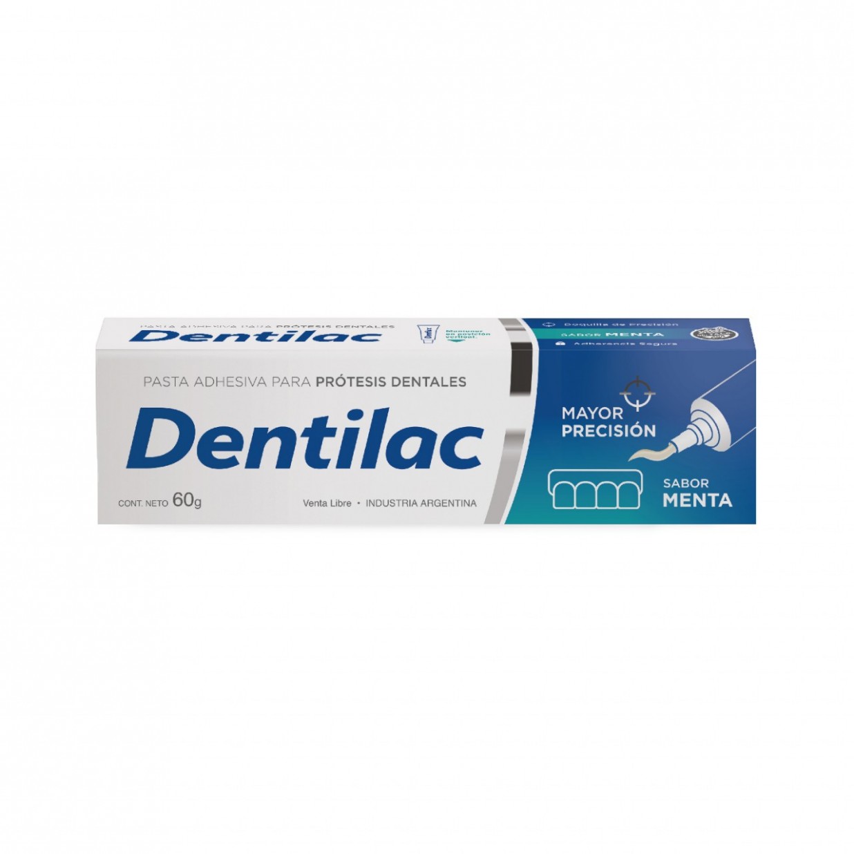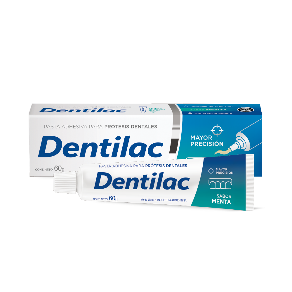 Dentilac es un adhesivo para prótesis dentales que garantiza hasta 9 horas de fijación prolongada. Sabor menta.