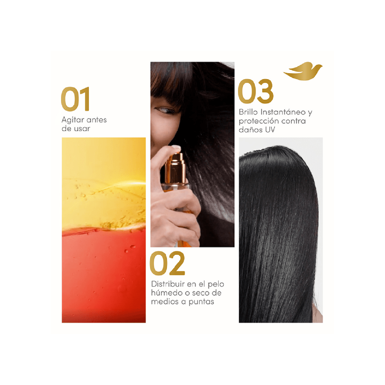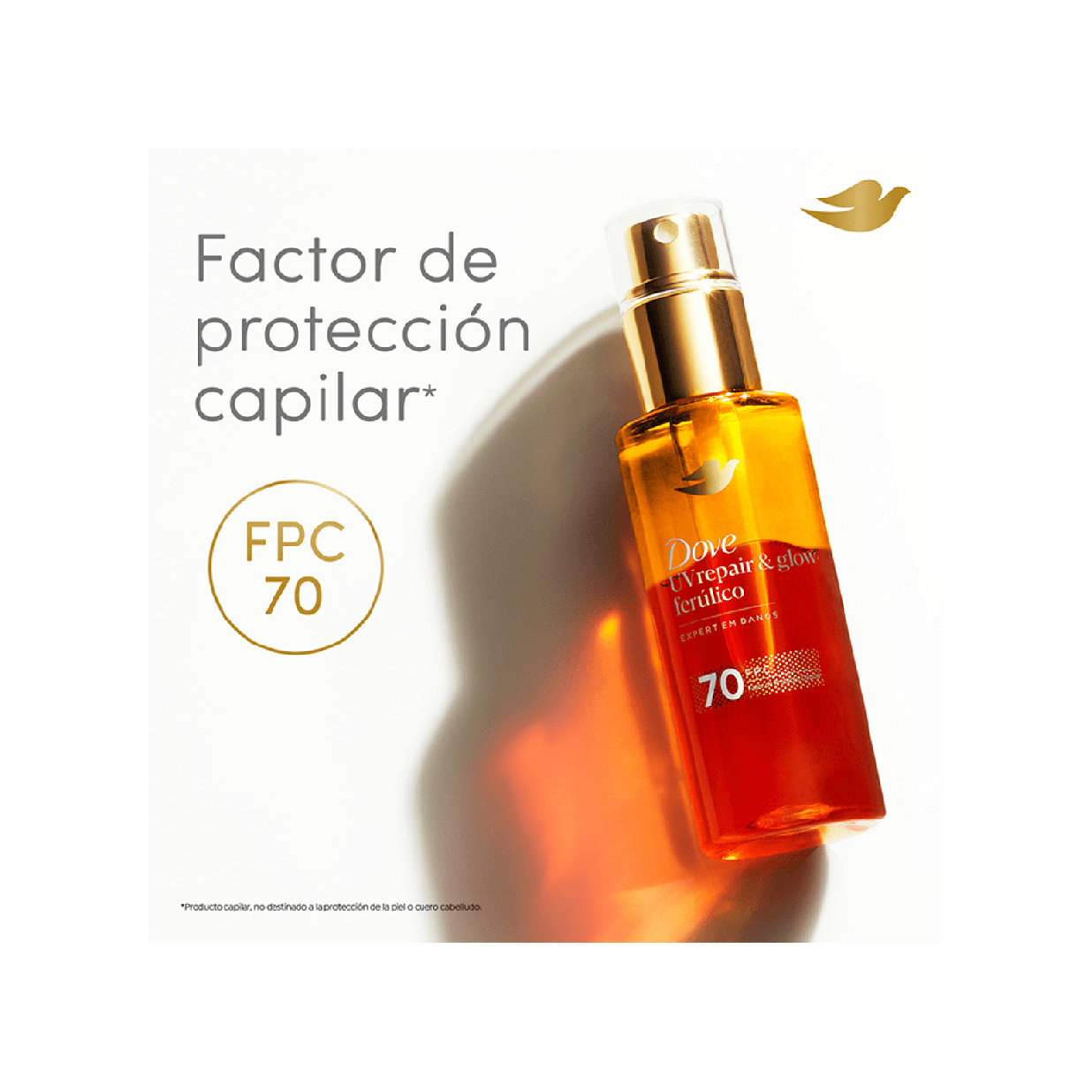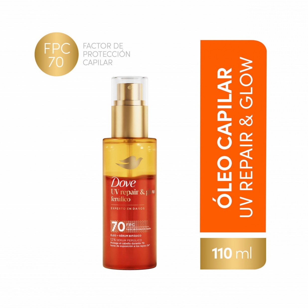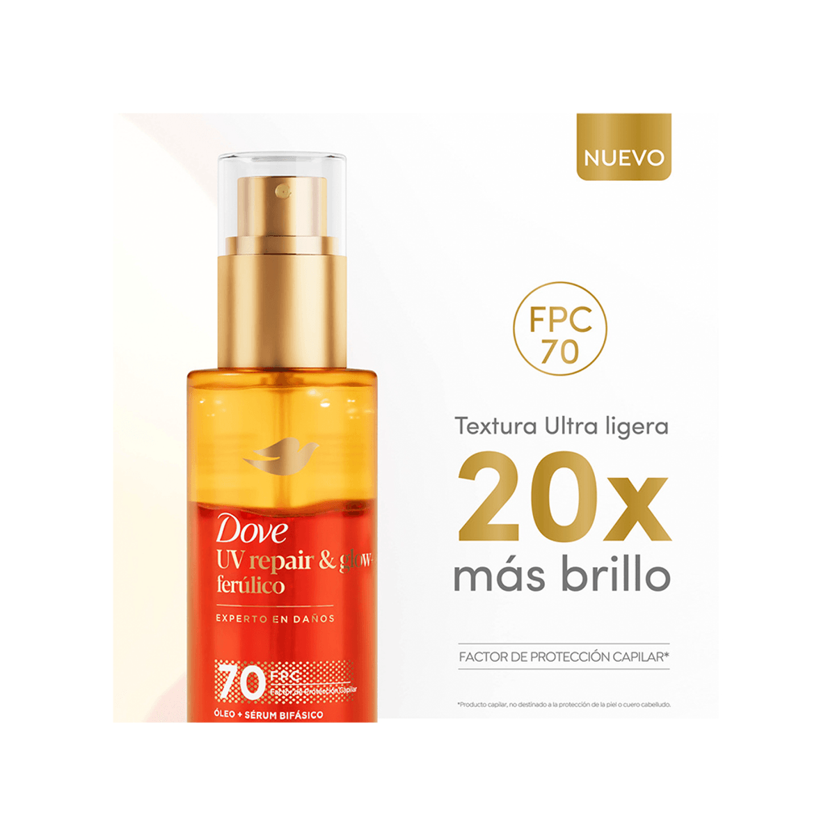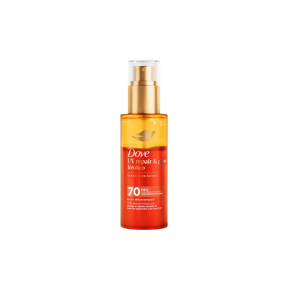 ¿Sabías que los rayos UV dañan 4 veces más el cabello que las herramientas de calor? Si tu pelo luce opaco y sin brillo debido a la exposición solar, llegó la solución que estabas esperando: el nuevo Óleo Sérum Bifásico Dove UV Repair and Glow. Este óleo sérum está especialmente desarrollado para vos, que buscás lo mejor para tu pelo y querés repararlo del daño que le hacen los rayos UV. Nuestra fórmula innovadora incorpora un factor de protección capilar 70 y 12% Sérum Ferúlico. Con esta tecnología patentada, reparará el 99% del daño acumulado y fortalecerá tu pelo. Dove, experta en reparación de daños, ha desarrollado este producto para cabellos dañados, que neutraliza y repara los daños internos. La tecnología Bio-Protein Care fortalece tu pelo, combatiendo el daño que lo deja opaco y sin brillo.