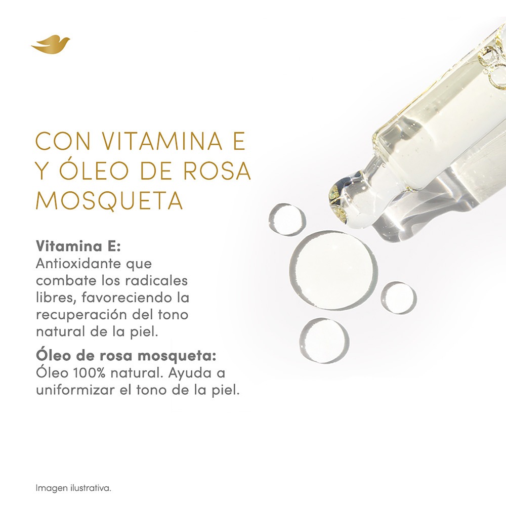 El Nuevo Dove Óleo Sérum Corporal Tono Uniforme ayuda a reducir la apariencia de manchas oscuras, dejando la piel luminosa y con un aspecto visiblemente reparado. Su fórmula combina Vitamina E, un antioxidante conocido por recuperar el tono natural de la piel y combatir los radicales libres causantes de manchas oscuras, con Óleo de Rosa Mosqueta, un óleo 100% natural que ayuda a uniformizar el tono de la piel. El resultado es una hidratación duradera y un efecto glow inmediato, ideal para quienes buscan una piel más suave, hidratada y con tono más uniforme. Su textura ligera se absorbe rápidamente, sin dejar sensación oleosa*, lo que permite una aplicación cómoda en cualquier momento del día. Clínicamente comprobado, este Óleo Sérum Corporal es apto para todo tipo de piel** y cuenta con una fragancia irresistible que transforma la rutina de cuidado en una experiencia sensorial. Incorporalo a tu rutina diaria y descubrí cómo tu piel puede sentirse más hidratada, luminosa y con un tono más uniforme.