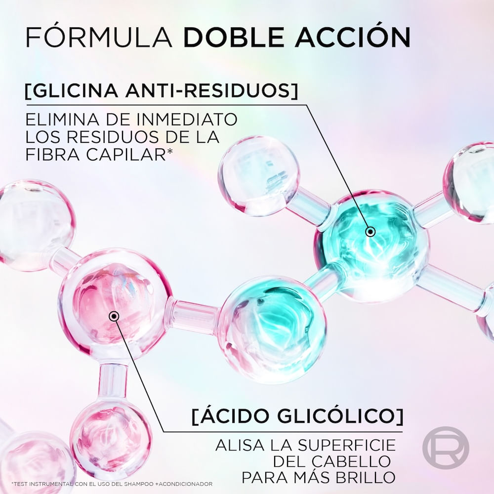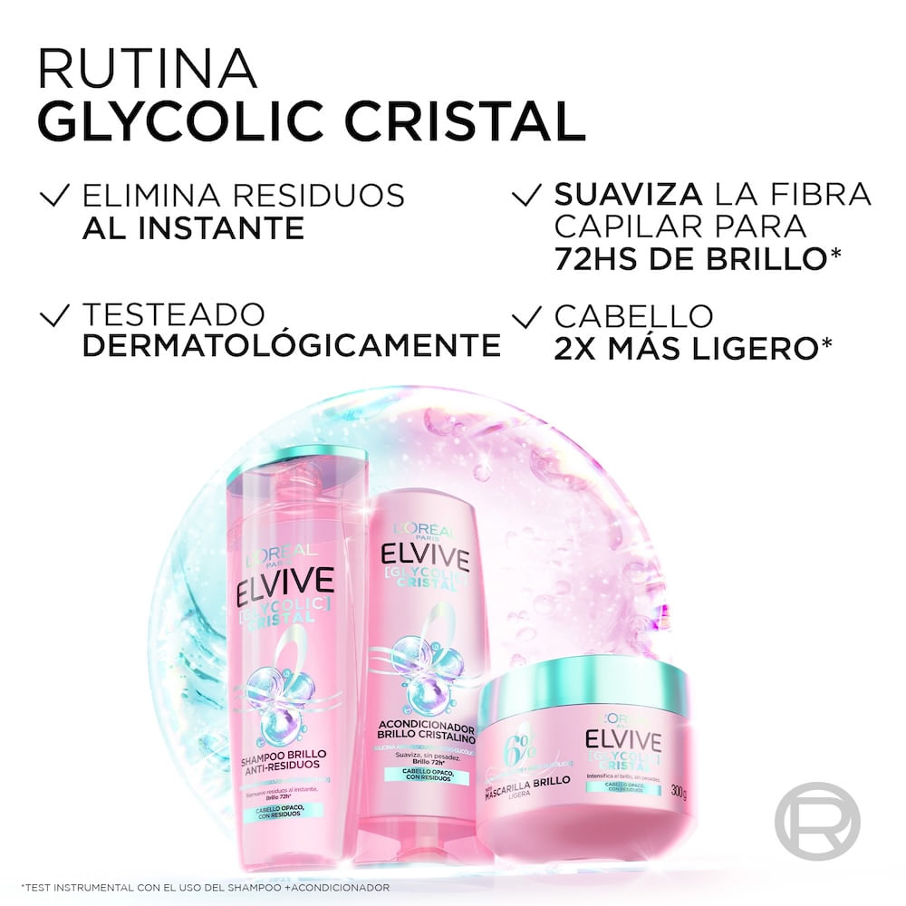 ¿Pelo opaco, pesado por residuos? Factores externos como la contaminación en el aire y en el agua, los tratamientos pesados y el uso recurrente de productos como uso recurrente de gel o la crema para peinar, recubren la fibra capilar de residuos dejando el pelo pesado e impidiendo la reflexión de la luz. Descubrí el shampoo Elvive Glycolic Crystal con [Glicina Anti-Residuos + Ácido Glicólico]. Esta potente solución capilar remueve instantáneamente las acumulaciones, dejando tu pelo 2x más ligero, con un brillo cristalino que dura hasta 72 horas**Test instrumental, con el uso del shampoo + acondicionador.