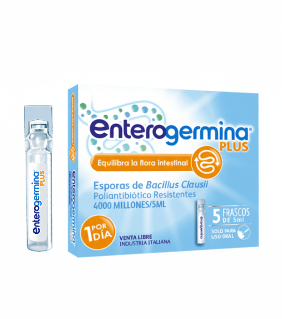 Enterogermina Plus x5 frascos es un probiótico que contiene Esporas de Bacillus Clausii, que llegan al intestino para restaurar la flora intestinal, fortalecer las defensas digestivas y aliviar la diarrea.