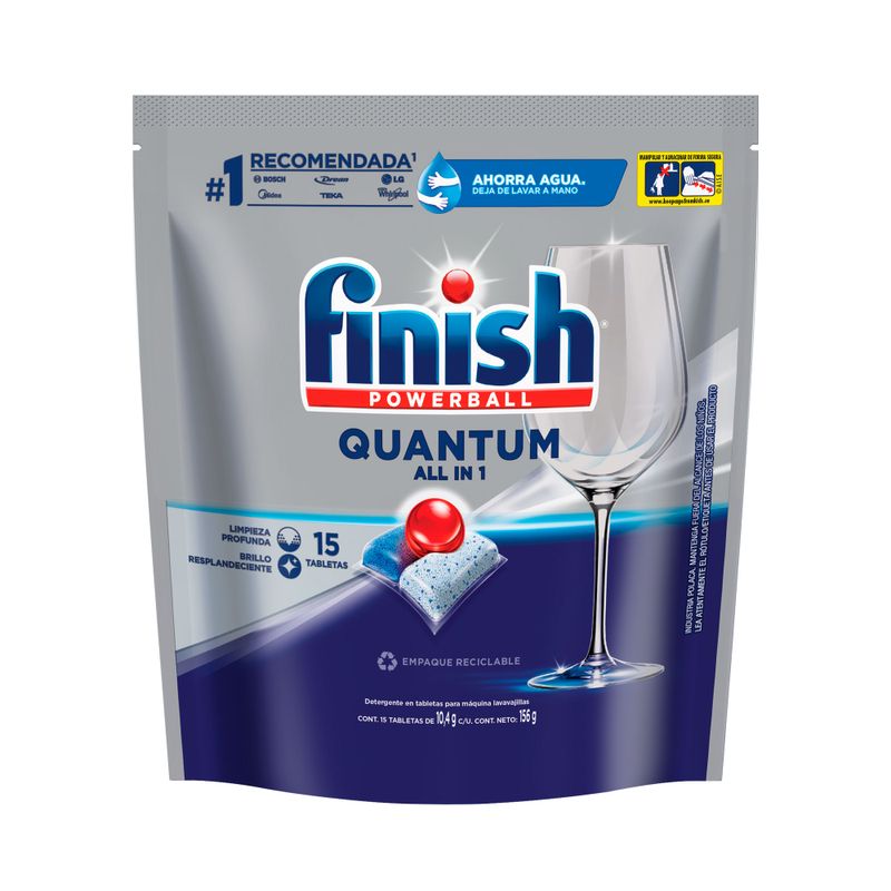 Finish Quantum All in 1, para una limpieza profunda y brillo resplandeciente en cada lavado. Su tecnología de 3 compartimientos remueve eficazmente los residuos de comida, sin necesidad de enjuague previo. Más eficacia con menos químicos que las tabletas tradicionales Finish.
