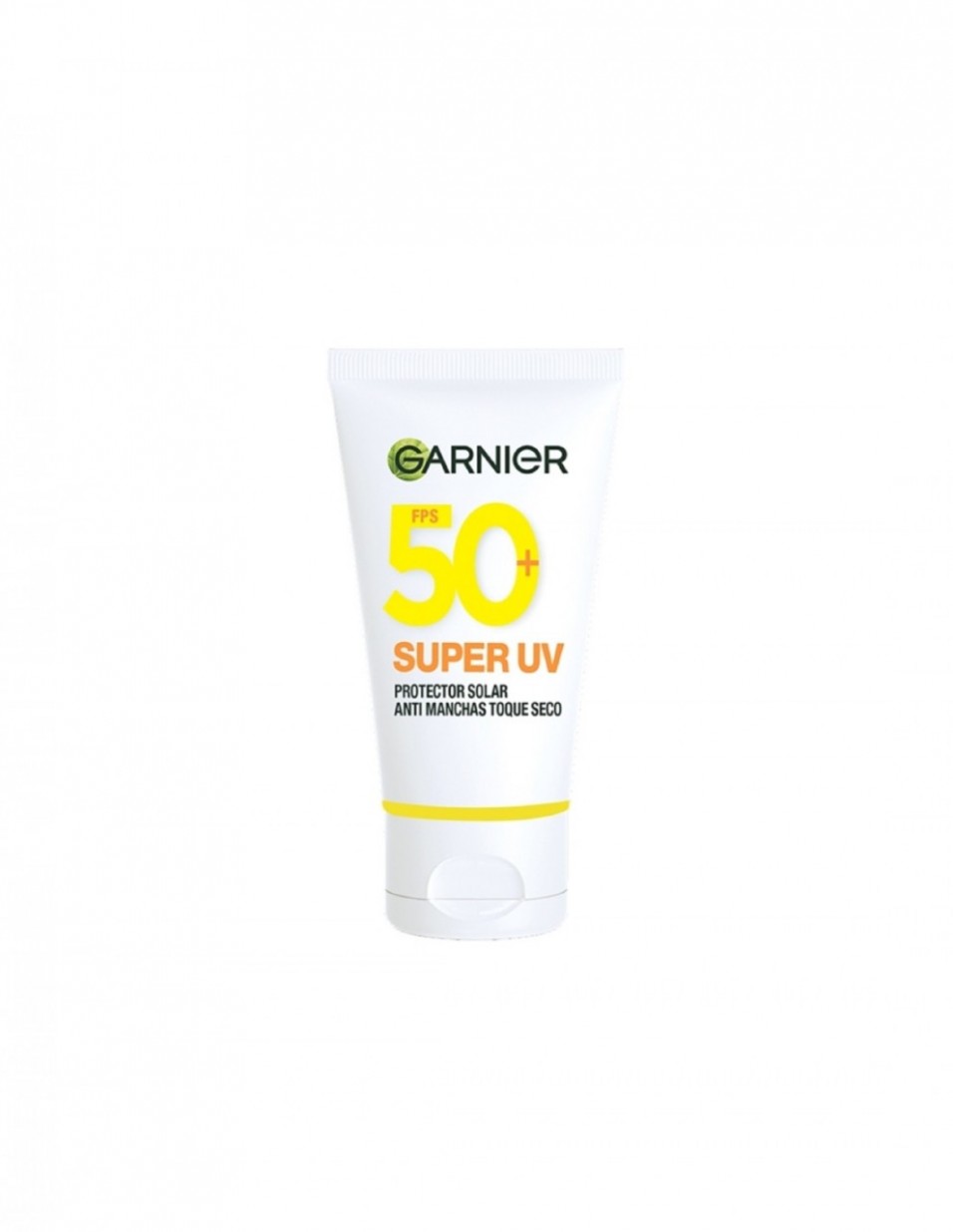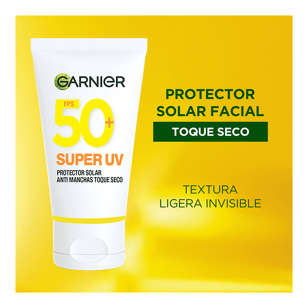 Nuevo Garnier Super UV Toque Seco con protección solar FPS50+. Tiene doble acción sobre la piel: protege de los rayos UVB y UVA con FPS50+ y aporta luminosidad gracias a su principal componente, la Vitamina C. Tiene textura ligera y efecto anti-oleosidad. Es ideal para todo tipo de piel, en especial para pieles mixtas a grasas que buscan efecto mate en su piel.