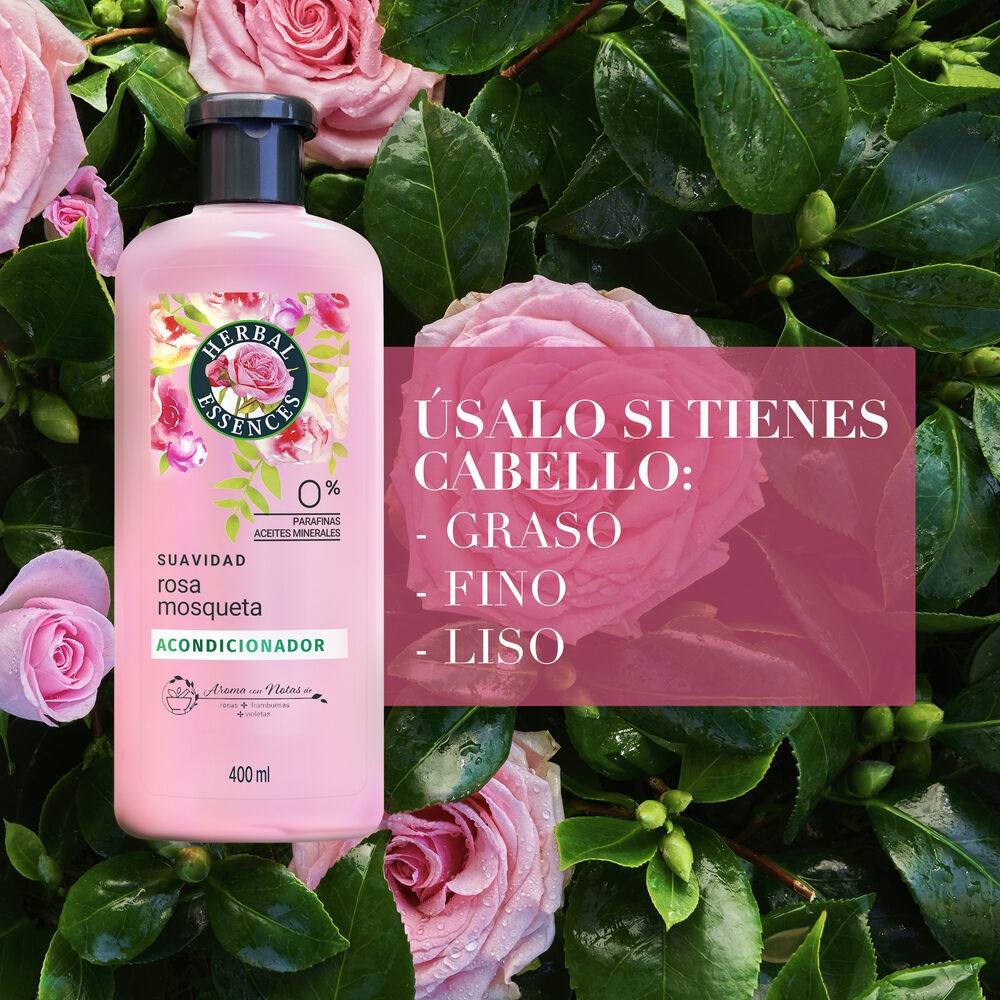 Acondicionador Herbal Essences con extracto de rosa mosqueta que proporciona suavidad y brillo al cabello. Ideal para uso diario, dejándote con un aroma a rosas frescas duradero durante todo el día. Formulado para todo tipo de cabello. Presentado en envase de 400 ml.
