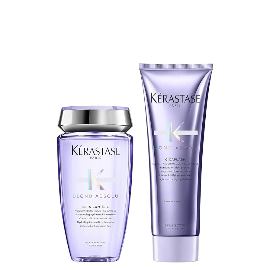 El Set Primavera Kérastase Blond Absolu es la combinación de cuidado perfecta para las rubias que desean preservar su color y nutrir intensamente su cabello. Este exclusivo set contiene dos productos imprescindibles: el Champú Bain Lumière (250 ml) y la Mascarilla Capilar Ultravioleta (200 ml). Juntos, proporcionan un tono rubio fresco y fresco con un brillo saludable.