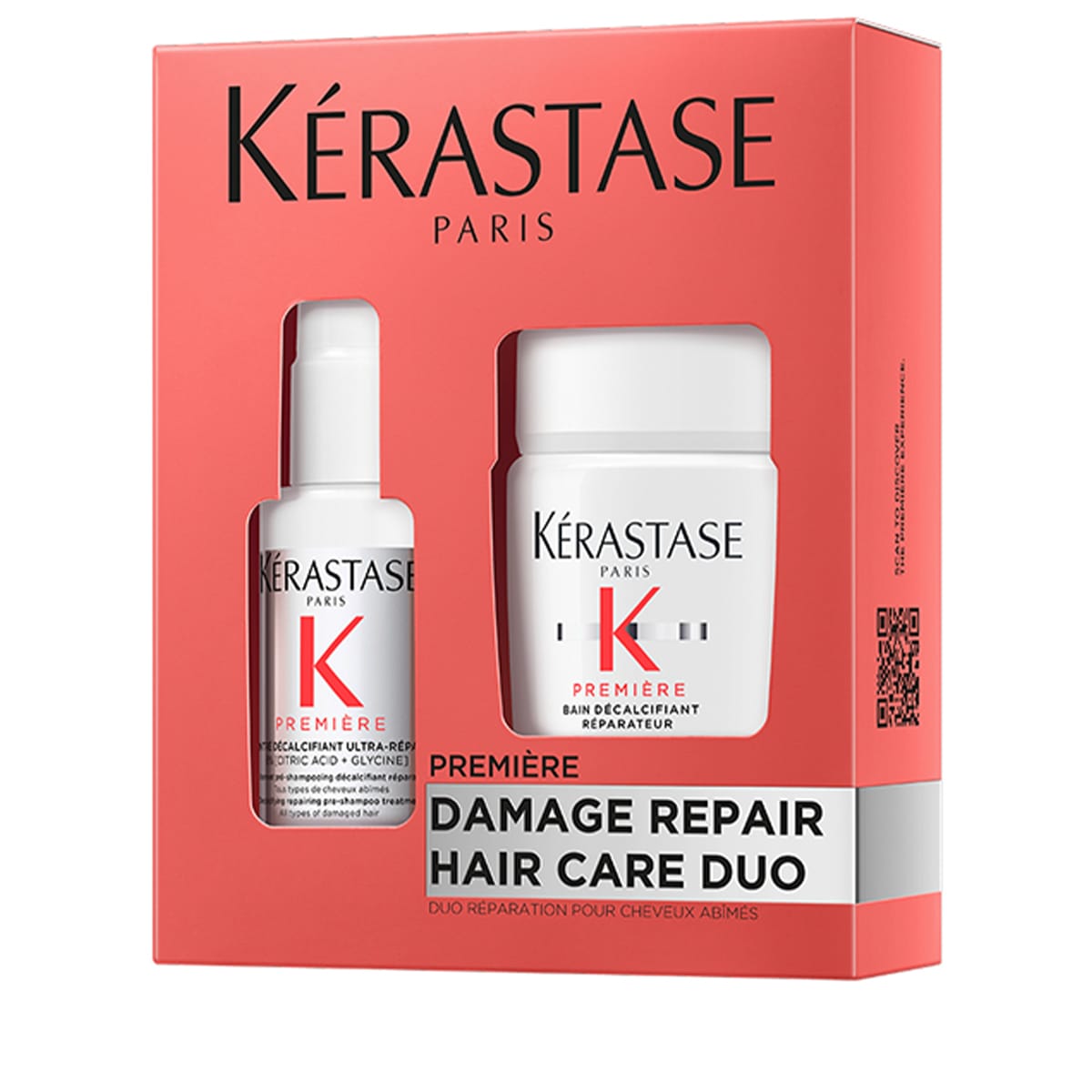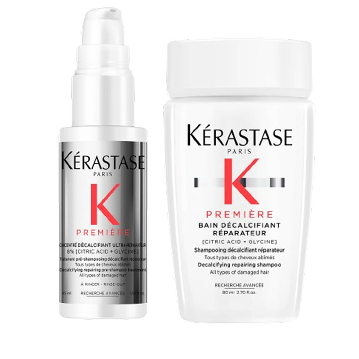 Tu Kérastase favorito en tamaño de prueba para cabello severamente dañado, compuesto por un concentrado reductor de calcio y un champú fortalecedor.