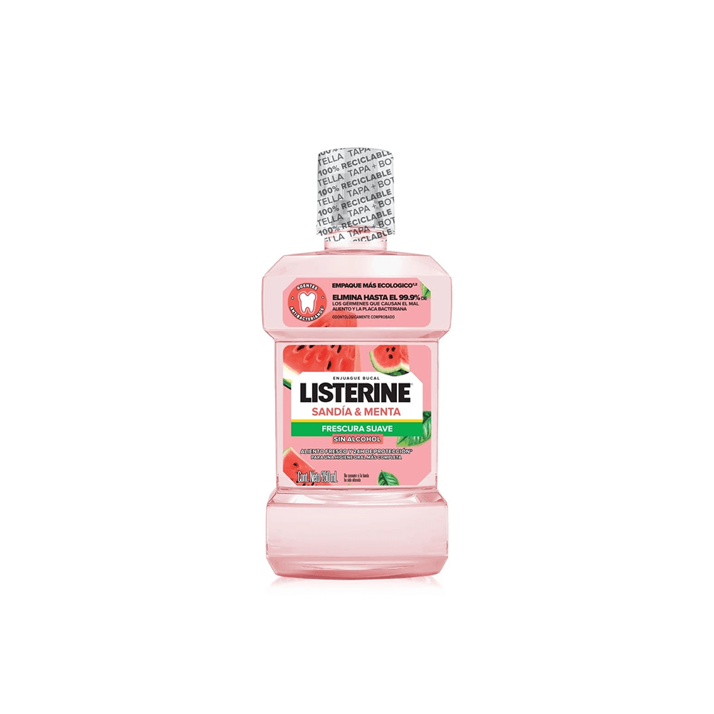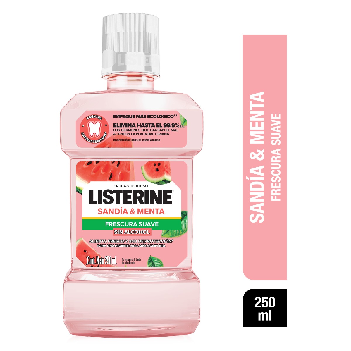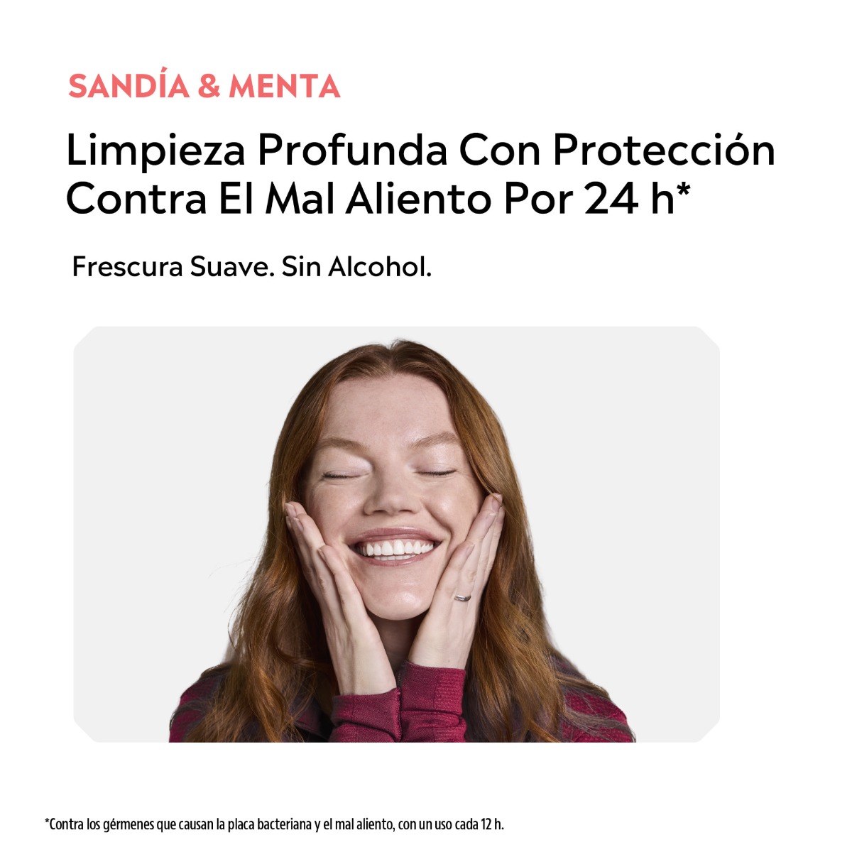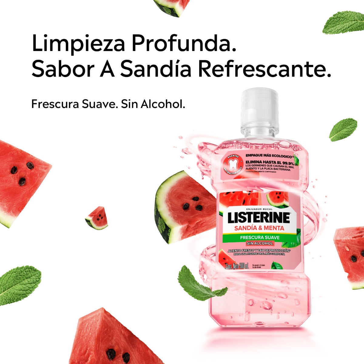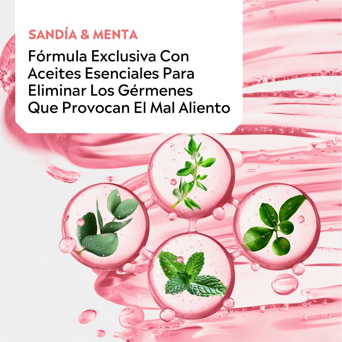 LISTERINE® SANDIA Frescura Suave. Fórmula exclusiva con agentes antibacterianos que eliminan hasta el 99,9% de los gérmenes que causan placa, gingivitis y mal aliento en solo 30 segundos. La innovadora combinación de los cuatro aceites esenciales de LISTERINE® (Timol, Eucaliptol, Mentol y Salicilato de Metilo) actúa sobre las bacterias escondidas en lo más profundo de la boca. Comprobado por Odontólogos.