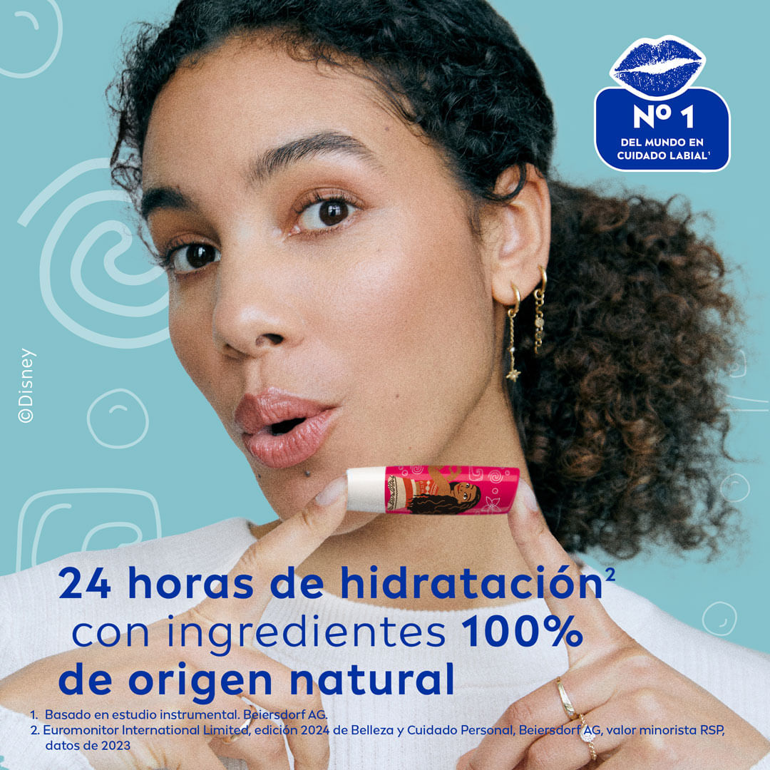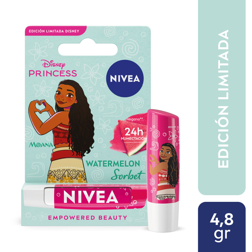 Empodera tu belleza con Bálsamo Labial de NIVEA Edición Limitada Disney de Moana, con su delicioso aroma a sandía fresca, proporciona un sutil brillo rosado a tus labios, ayudándolos a mantenerse protegidos del frío, viento y aire seco. ¡Humectación por 24 horas* - Clínicamente probado! Y tú, ¿con qué princesa te identificas? Moana es tenaz y optimista. Se enfrenta al mundo con independencia y determinación, e inspira esa energía a todos a su alrededor. Fórmula vegana con manteca de karité de origen éticamente responsable, y aceites naturales enriquecidos con vitaminas.