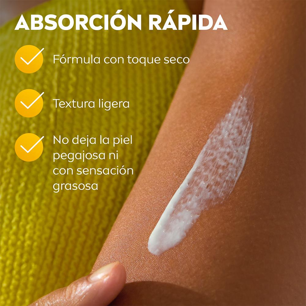 Alta protección solar con FPS 50. Rápida absorción con acabado invisible. Hidratación profunda con Ácido Hialurónico. Resistente al agua. Apto para todo tipo de piel.