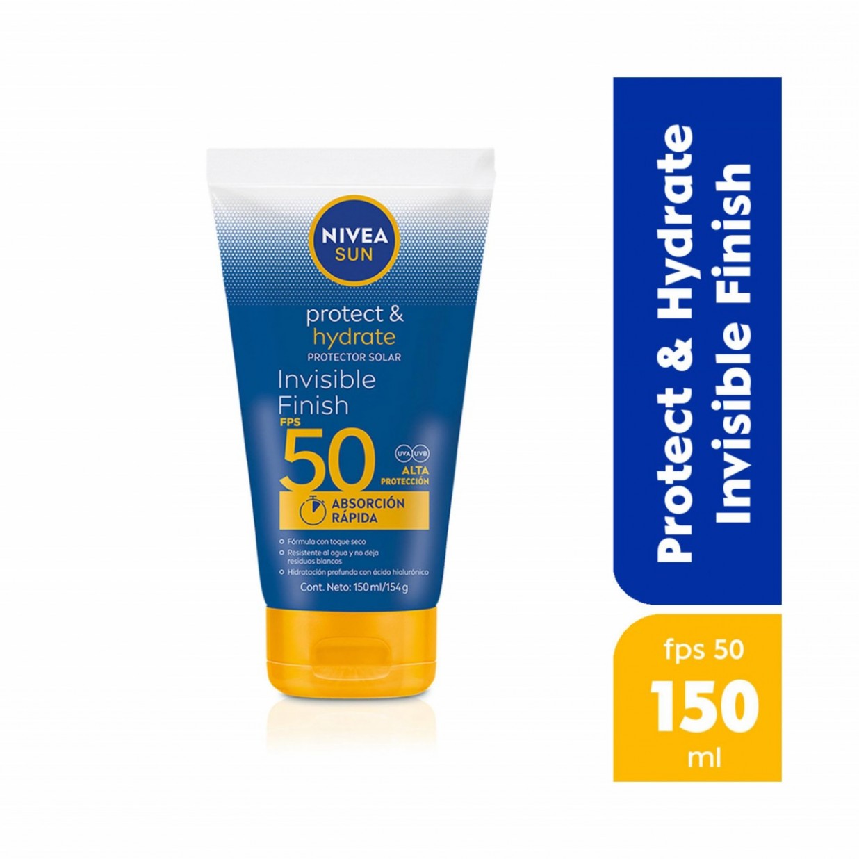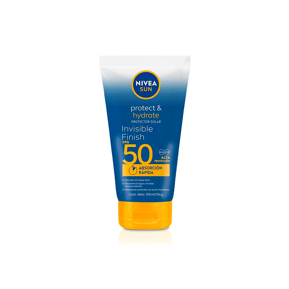 El protector solar NIVEA SUN Protect & Hydrate Invisible Finish FPS 50 ofrece una fórmula de rápida absorción, con Ácido Hialurónico para una hidratación profunda y duradera. Protege frente a los daños causados por los rayos UVA y UVB; mientras brinda el cuidado que necesita la piel todos los días. No deja residuos blanco y es resistente al agua, lo que lo convierte en el aliado perfecto para actividades al aire libre. La piel lucirá saludable, seca y no pegajosa. Su envase contiene 50% de plástico reciclado y es libre de filtros UV dañinos para el océano. Dermatológicamente probado, apto para todo tipo de pieles. Ideal para toda la familia y para uso diario en rostro y cuerpo.