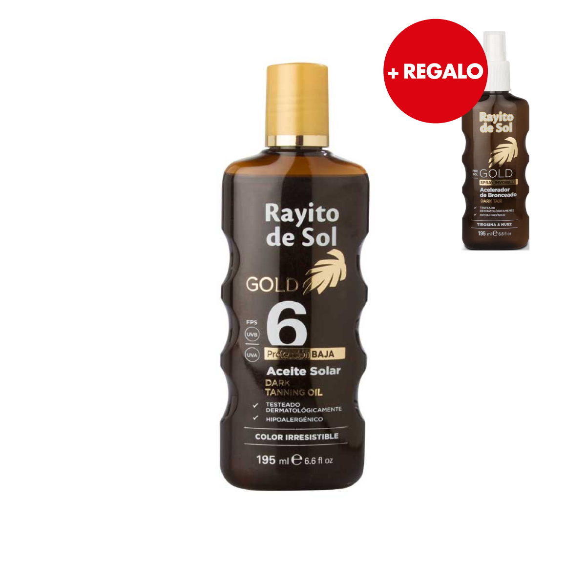 Rayito De Sol Aceite Solar FPS 6 Aceite Solar FPS 6 Gold es un aceite bronceador con factor de protección solar bajo, recomendado para pieles resistentes al sol. Para un bronceado perfecto, de color dorado intenso y apariencia lustrosa con una sugerente fragancia a coco que te envuelve de verano desde el primer minuto.