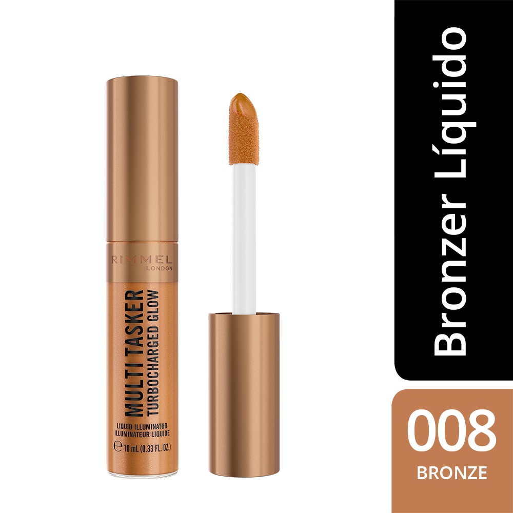 Bronzer líquido Multi Tasker Turbocharged Glow de rimmel, potenciado con perlas que reflejan la luz y vitaminas C y E. La colección Turbocharged incluye rubores, bronzers e iluminadores para lograr tu mejor glow.