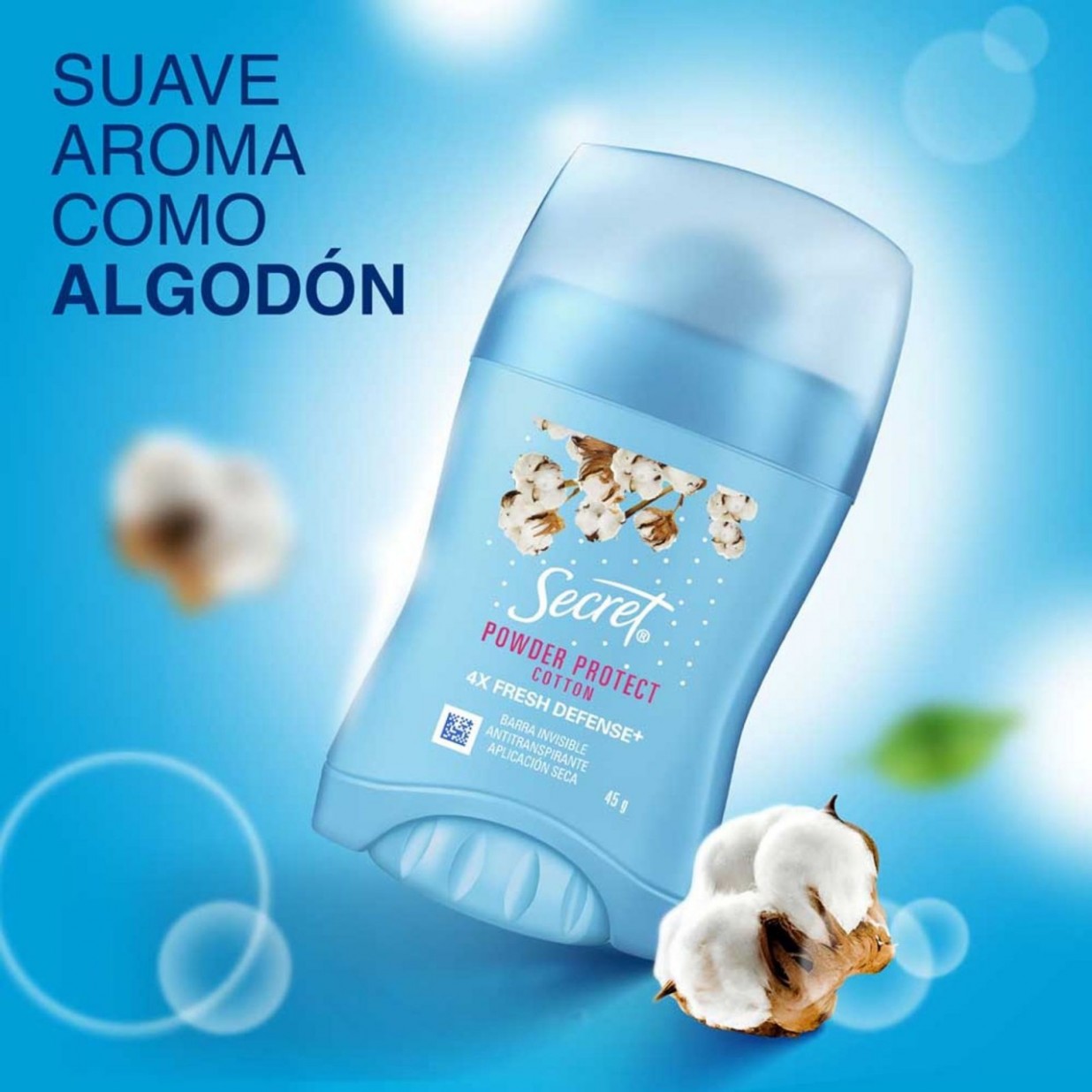 El desodorante antitranspirante en Barra Powder Protect Cotton de Secret tiene un suave aroma como a algodón. Con aplicación seca, te protege encapsulando el mal olor y ayudando a eliminarlo, gracias a su tecnología con Active Caps. Contiene ingredientes acondicionadores para la piel. Siéntete protegida y fresca todo el día. Fácil de usar, se aplica directamente en la piel. Quita la tapa y gira el disco de la base, aplícalo diariamente en las axilas y asegúrate de mantener el envase bien cerrado. Caracteristicas: SUAVE AROMA COMO A ALGODÓN. Siéntete protegida y fresca todo el día con la protección contra el sudor y el mal olor que te ofrece el desodorante antitranspirante en Barra de Secret APLICACIÓN SECA. Con tecnología Active Caps, encapsula el mal olor, ayudando a eliminarlo. Con ingredientes acondicionadores, cuida tu piel LIBRE DE CRUELDAD ANIMAL: Secret es una marca libre de crueldad certificada por PETA MODO DE USO. Fácil de usar, se aplica directamente en la piel. Quita la tapa y gira el disco de la base, aplícalo diariamente en las axilas y asegúrate de mantener el envase bien cerrado