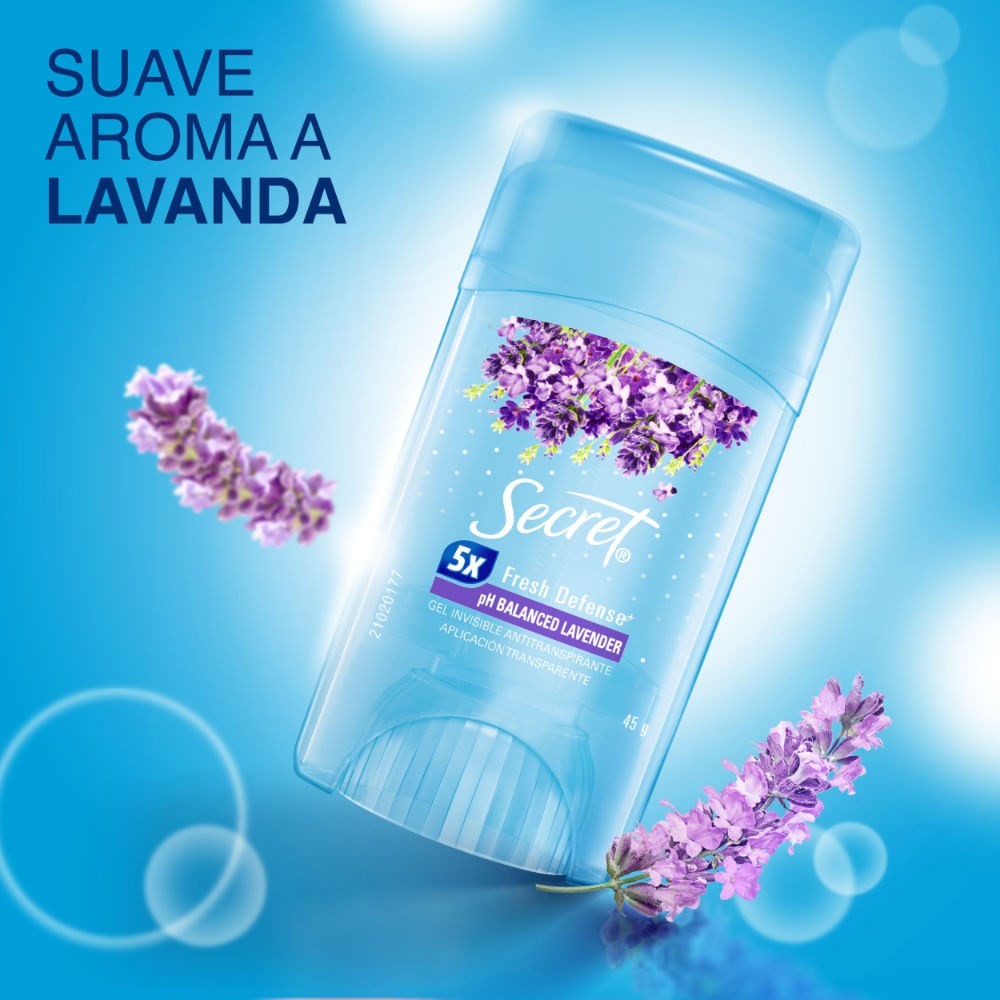 El desodorante antitranspirante en Gel pH Balanced Lavender de Secret tiene un suave y relajante aroma a Lavanda y rinde hasta 60% más*. Con aplicación transparente, te ofrece protección contra el sudor y el mal olor, sin dejar manchas blancas en la aplicación. Siéntete protegida y fresca todo el día.