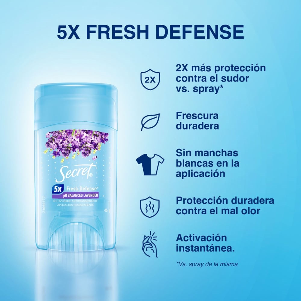 SUAVE AROMA A LAVANDA. Siéntete protegida y fresca todo el día con la protección contra el sudor y el mal olor que te ofrece el desodorante antitranspirante en Gel de Secret.