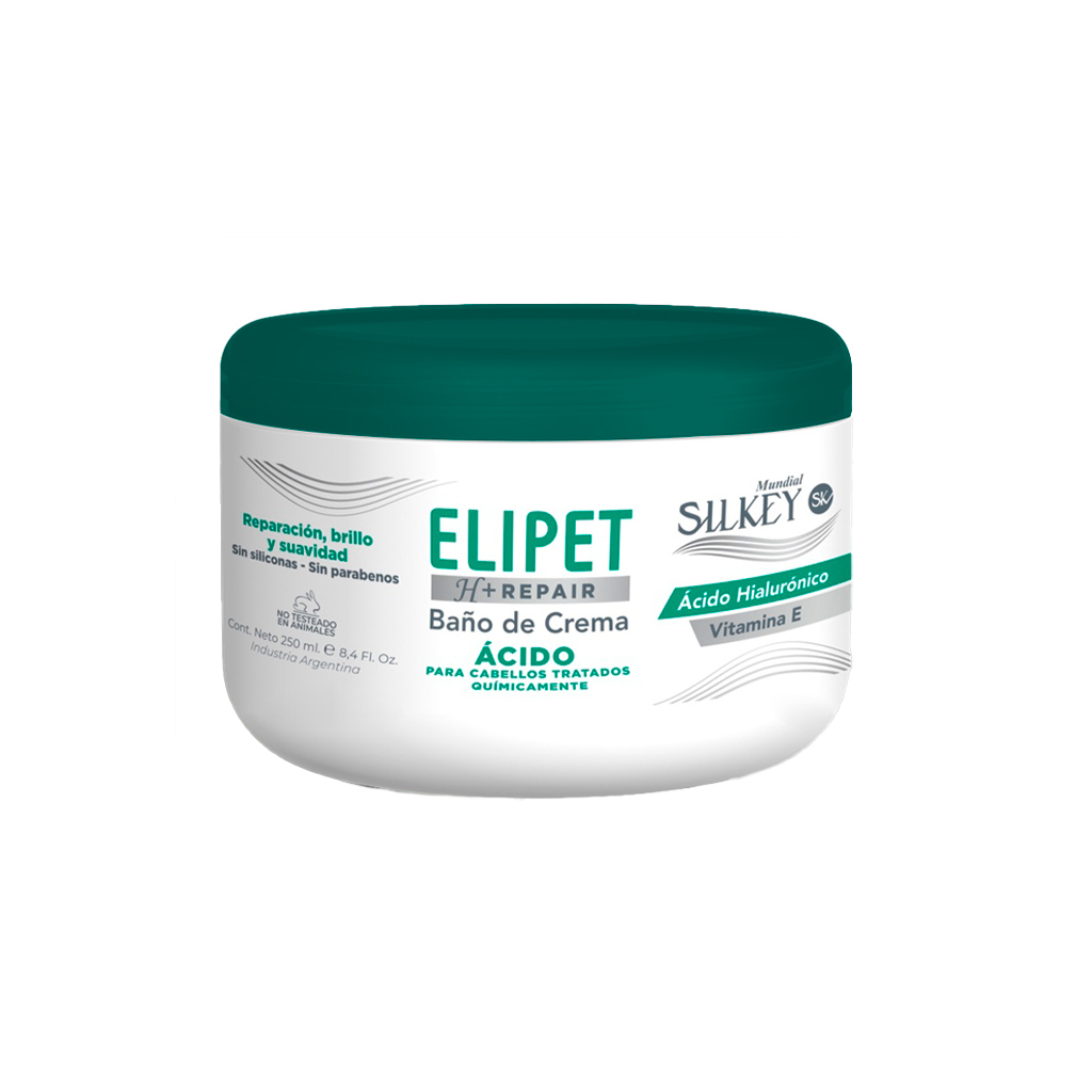 MODO DE USO: Luego del lavado con Shampoo Ácido Elipet H+ Repair, aplicar Baño de Crema Ácido Elipet H+ Repair sobre el cabello limpio y húmedo. Masajear y distribuir de medios a puntas. Dejar actuar de 3 a 5 minutos. Enjuagar con abundante agua tibia. Peinar y secar como de costumbre.