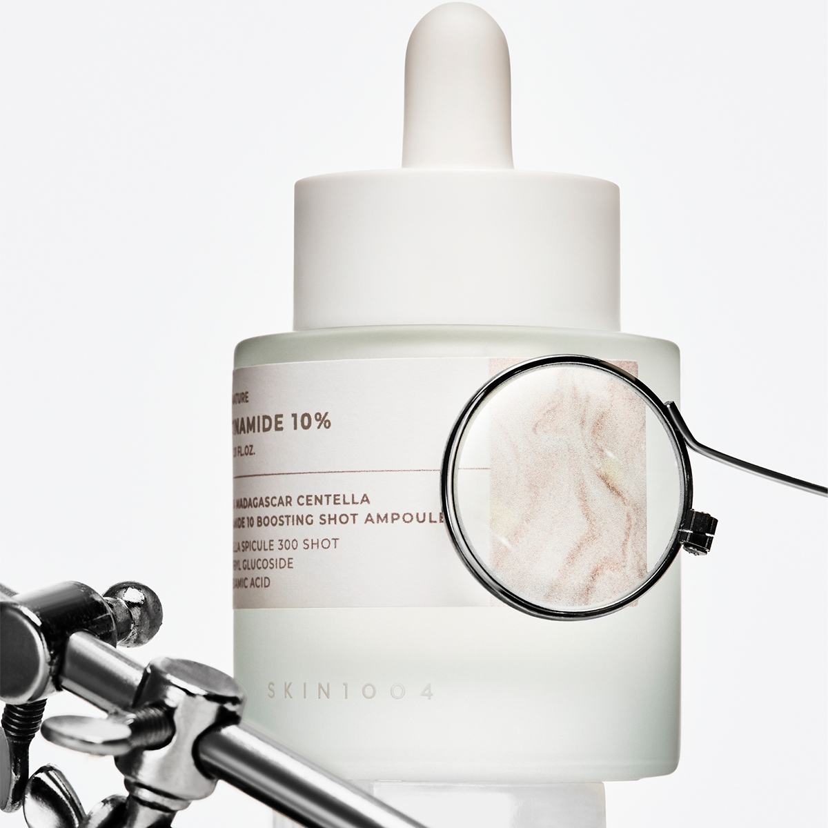 Skin1004 Niacinamide 10 Boosting Shot Ampoule es un tratamiento intensivo formulado con 10% de niacinamida, ácido tranexámico y centella asiática, diseñado para tratar poros dilatados, manchas, textura irregular y falta de luminosidad. Su fórmula clínicamente probada incorpora una innovadora tecnología de espículas naturales tipo microagujas, que crea microcanales en la piel y mejora drásticamente la absorción de los activos. Ideal para todo tipo de piel, especialmente piel grasa, mixta o sensible, esta ampolla mejora visiblemente el tono y la textura en pocas semanas.