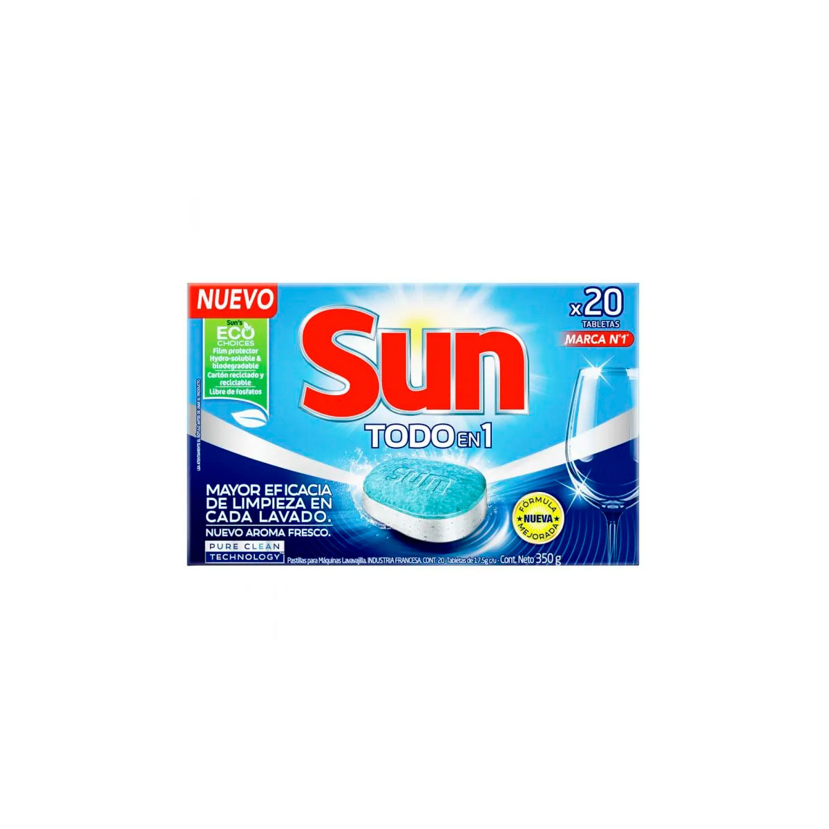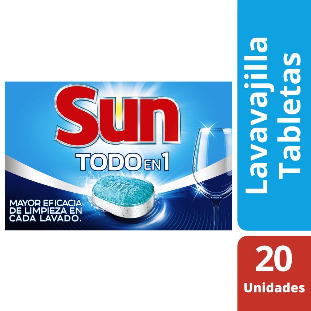 Limpieza completa en 1 lavado con las tabletas lavavajillas Sun Todo en 1 Conforma una solución completa para el proceso del lavado en la máquina lavavajillas. Abarca todas las funciones tales como desengrase y remoción de manchas difíciles, vajilla reluciente y cuidado del lavavajillas. La formulación contiene secuestrantes y polímeros para prevenir la deposición de una lámina de sales insolubles en la superficie de la vajilla, causada por aguas duras. Una tableta Sun contiene surfactantes que disuelven las manchas de grasa y previenen la formación de manchas en la vajilla durante el proceso de secado. Las tabletas para lavavajillas contiene amilasa para limpiar suciedades a base de almidón (arroz, papas, pasta, etc) y proteasa para limpiar suciedades a base de proteínas (huevo, leche, queso, etc).