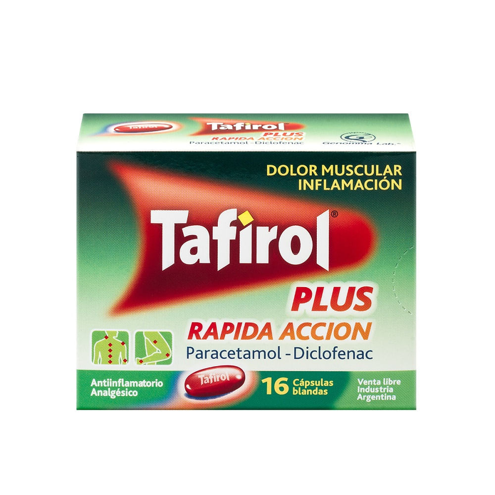 Tafirol Plus es una fórmula única de Tafirol en capsula blanda de rápida acción con el PLUS de un antiinflamatorio para aliviar dolores más intensos. Su fórmula contiene Paracetamol 300 mg y Diclofenac 25 mg indicado para dolores; musculares, de espalda, menstruales y articulares. Antinflamatorio y Analgésico. Se pueden consumir en adultos y niños mayores a 15 años 1 capsula blanda cada 8 horas, dosis máxima 3 capsulas por día. Máximo 10 días de toma.