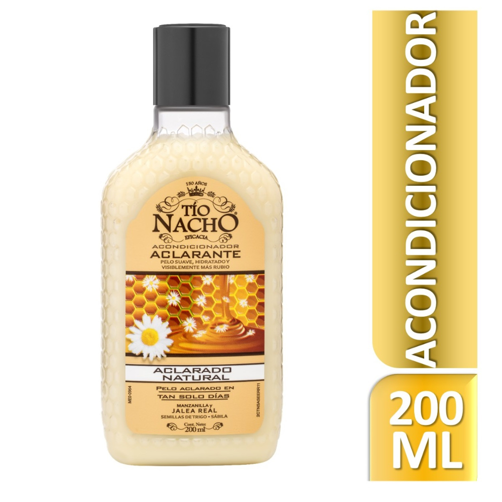 El acondicionador Tío Nacho Aclarante posee una fórmula con jalea real, manzanilla y semillas de trigo que ayuda a fortalecer y suavizar la fibra del pelo así como a aclararla gradualmente*.