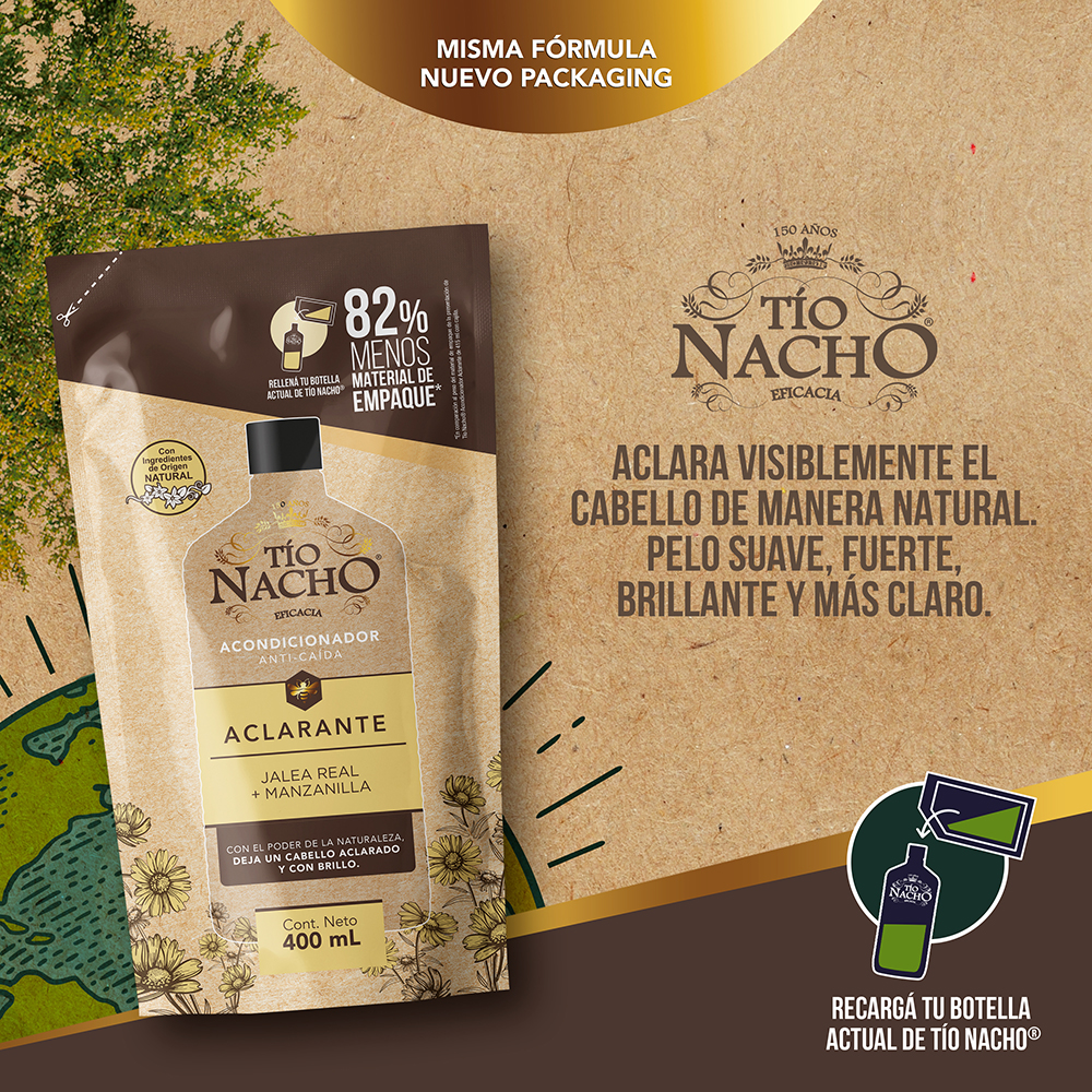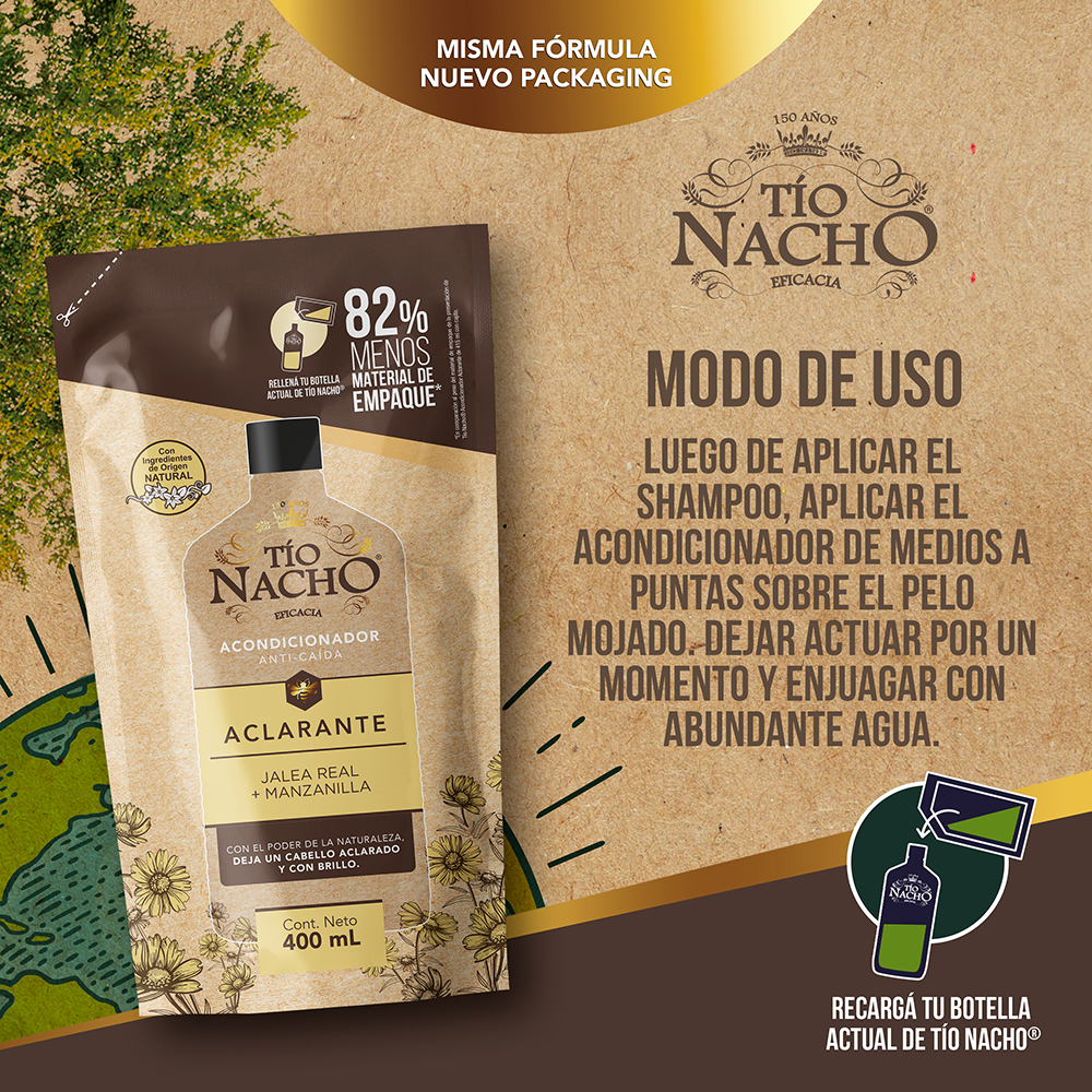 Acondicionador Tío Nacho Aclarante, con jalea real, manzanilla y extractos de origen natural.