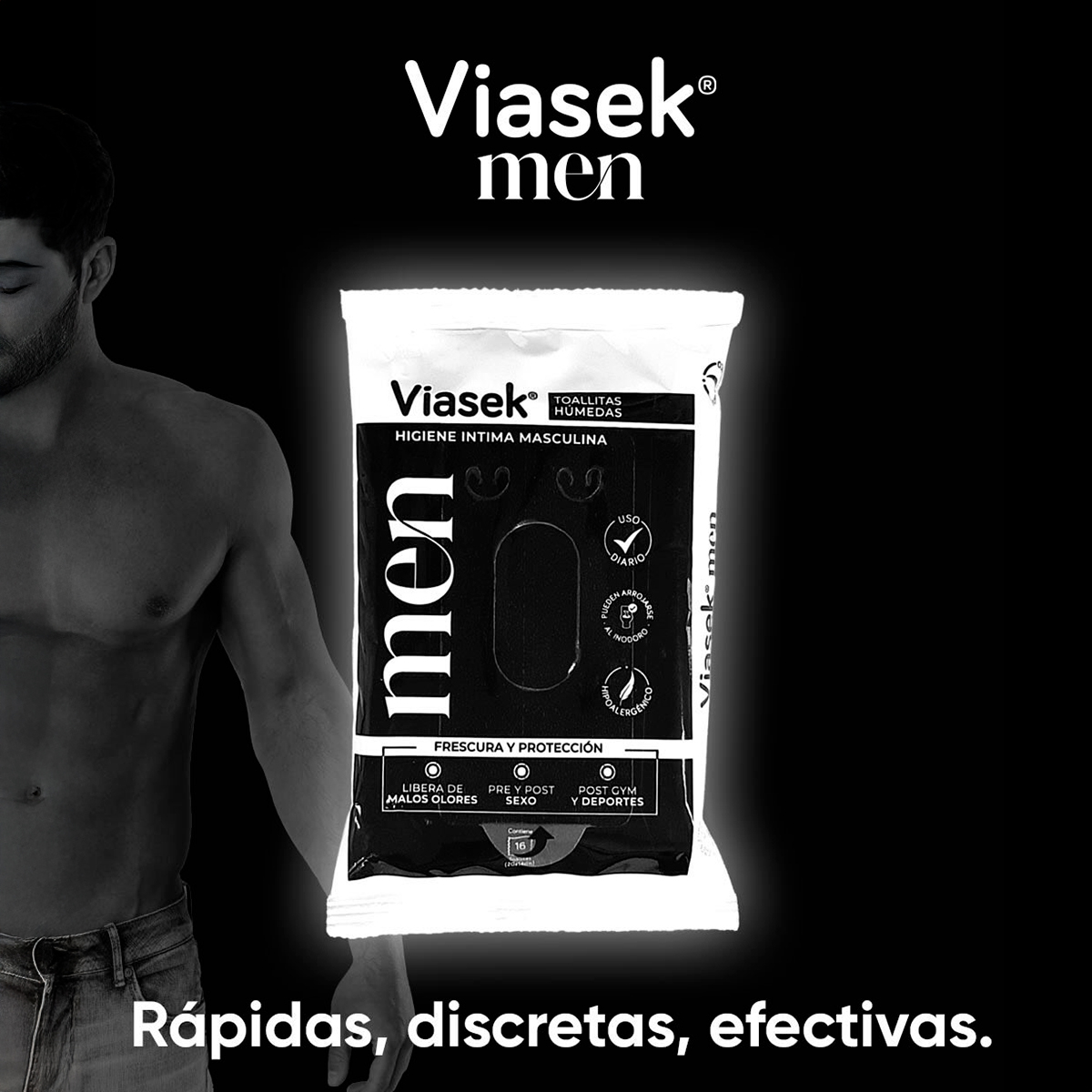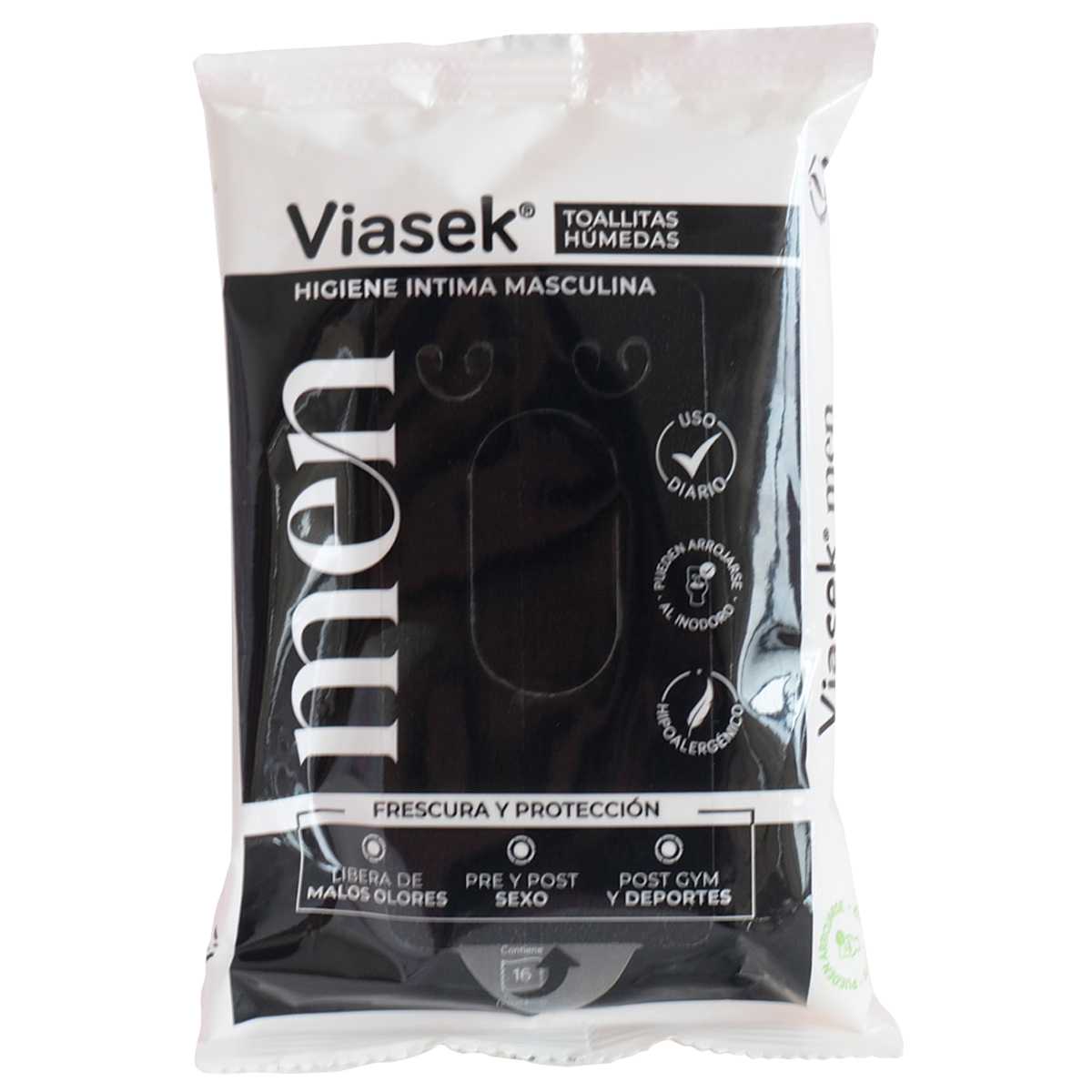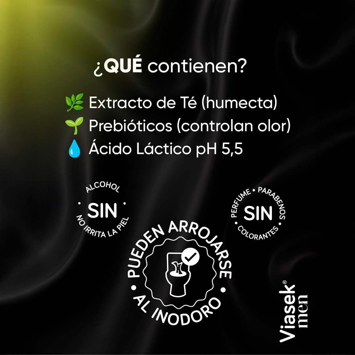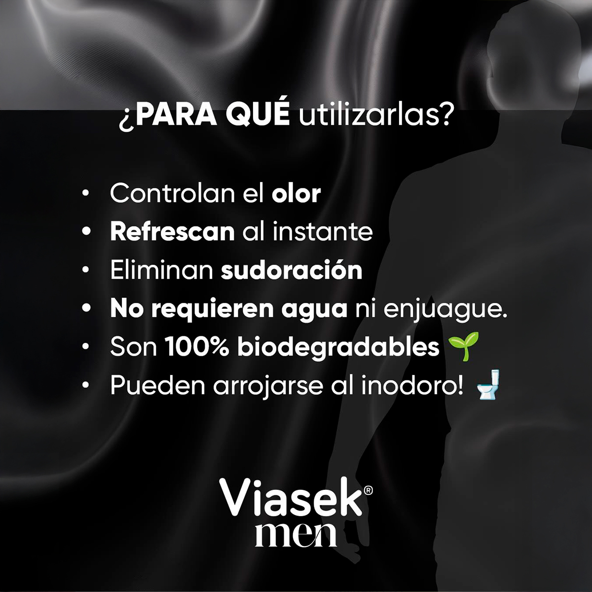 Viasek Men Toallitas Húmedas para Higiene Íntima Masculina están especialmente formuladas para la higiene diaria de la zona genital del hombre. Elaboradas con fibras vegetales ultrasuaves, respetan el pH fisiológico masculino y ayudan a mantener una correcta higiene íntima en cualquier momento del día, incluso fuera de casa. Su fórmula sin perfumes, alcohol ni parabenos brinda limpieza efectiva, confort y frescura sin irritar la piel.