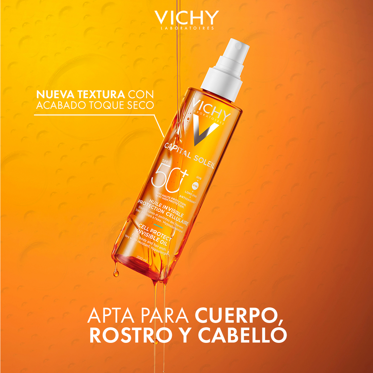 Aceite Invisible Cell Protect SPF50+ protege la piel del daño solar a nivel celular con una sensación de aceite seco ultrasensorial.Para el rostro, el cuerpo y las puntas del cabello.